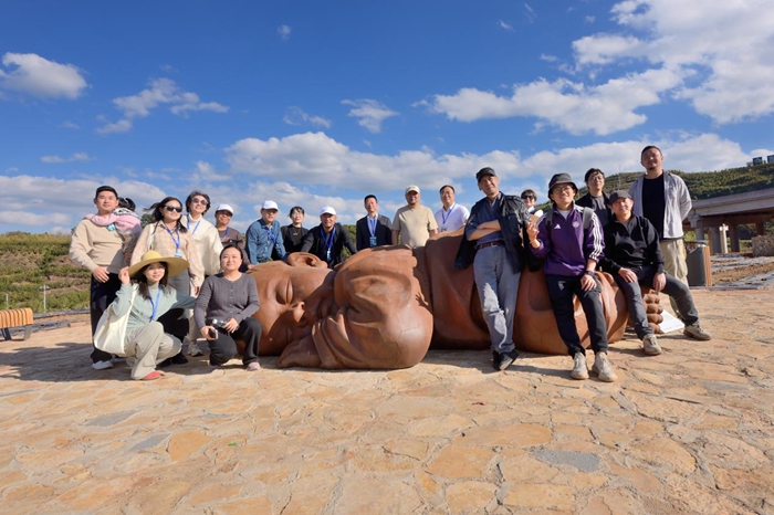 若说从文化根脉汲取灵感是在地创作的‘魂’,那么以本土材料注入巧思,则为作品增添了几分生活的温度与趣味。孔繁迪的《嗨》运用农具和塑料管组合成稻田收割后干草堆的形态,并轻巧的加入“手臂”做成和路人打招呼、比心的样子;李佳昱的《大地调色》以当地多彩的农作物作为颜料,制成巨型画架中的田园画作,他说:“把田野当画布,让麦浪作颜料,在天地间调色,于大地上写诗”。刘有刚的《姜州客》独具匠心,他取当地红岩于水池中雕琢出一个悠然泡澡的石头人,那悠然之态,瞬间将“客人”拽入惬意之境。创作期间,他目睹工人们光脚下田,徒手拌水泥做大型构件——因长期与水泥打交道,工人们早已习惯这般操作。刘有刚好奇尝试,不料手被灼伤。起初,当地居民不明就里,见他们施工总觉碍事。待大型初现,居民态度矣变,亲昵地称这石头人为“奶包包、大胖子”。这些散落田间地头的艺术巧思,巧妙消弭了艺术与大众的隔阂,让作品不再曲高和寡,而是能轻松融入当地生活,引得居民与游客会心一笑。