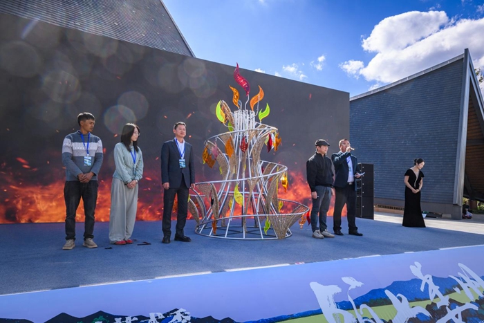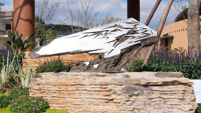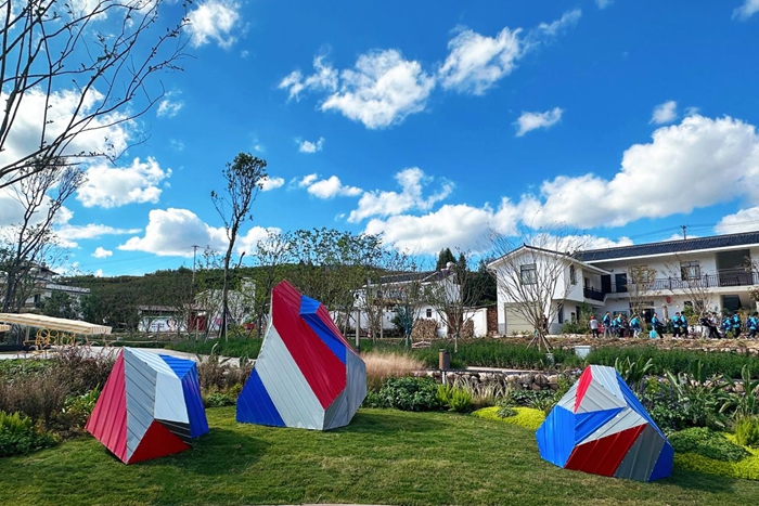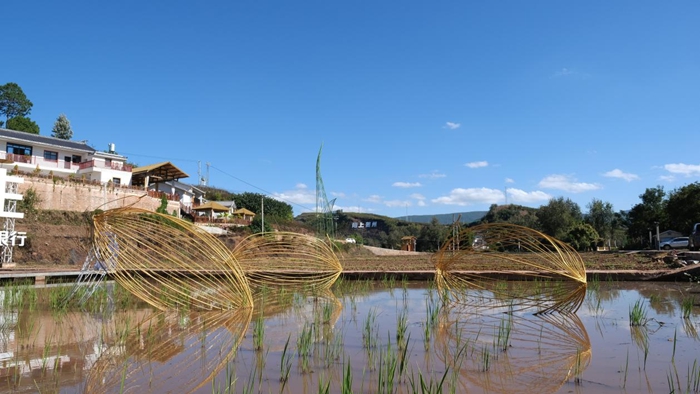 除此之外,驻地艺术家吴丽云的《新生》,因不可抗力在创作期间历经数次选址调整,最初的位置是在稻田当中,但为了不打扰农作物机器的运作,摆放阵列更换多次,最终在与策展人探讨后放入水中,不曾想放入水中的方式为作品本身的诠释和展呈效果都比在田间更精彩。作者以钢筋线性结构放大稻谷与新芽的微观形态,在水中形成了倒影,获得了令人意外的副空间。门琬凝的作品《焱焱》将彝族传统纹样融入火焰形态为轮廓的亚克力彩片上,螺旋结构模拟彝族火把节的篝火堆形态。这件作品被策展人柴鑫萌设置成为了开幕仪式上的重要一环,使得作品除了文化性本身又具备了展演性质,在实现本土文脉的艺术表达的同时,更好的诠释地域祈福寓意。本次展览的多次展呈创新,使得作品重新适配乡土语境和现场空间,唤醒了作品的第二次生机。