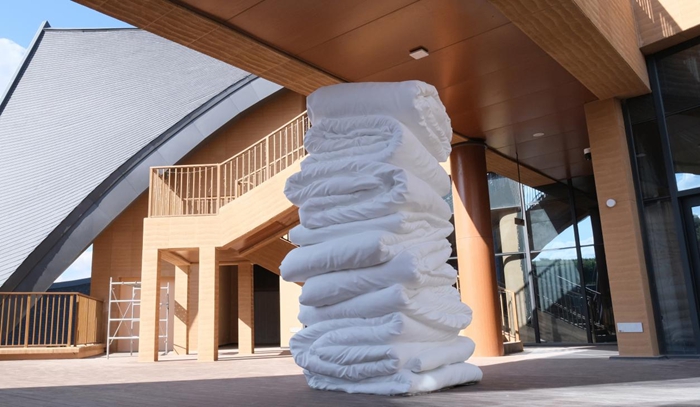 作为全程参与本次艺术季的艺术家之一,我留意到策展人柴鑫萌和杨智超在本次展览中赋予了很多作品一些新的图景,布展团队将董书兵的代表作《大地之子》置于花圃平台之上,空旷的周边使得《大地之子》更加独立而凝注“生生不息”的生命哲思,其作品本次以耐候钢塑婴儿酣态,使得冰冷材质藏温润张力。将许正龙的《金苹果》从一成不变的白盒子空间中解放出来,挂在树上的巧思使得作品在自然环境下形成与视觉经验不同的奇特风景。在开幕式的集市对面放着柳青的《成果 2018》,那些以树脂着色堆塑蔬果,正如“摆摊”一般呼应着对面的市集,但同时又以作品的身份跳脱出来。宿志鹏作品《Honor the Sky》的摆放运用了会东之眼建筑本身的特有空间,将这叠被子在半户外空间也实现了“顶天立地”的状态,此作品在以往的展呈当中都是在室内经验为主,本次的新地点或许会为作品本身带来新的解读。