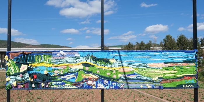 钢构为骨,柔绳为墨,线绳在金属框架间错落起伏,巧妙将姜州土地的纹理、田间作物的斑斓色彩,以及村落里的烟火日常,都凝练成可触碰、可感知的实体记忆。最后由柴鑫萌做整体的收尾归纳,这幅共创的作品,不仅是一次艺术实践,更化作一场关于土地眷恋、劳作传承与万物共栖的温情对话,让姜州的自然灵秀与人文暖意,在每一寸编织的肌理中悄然流淌。