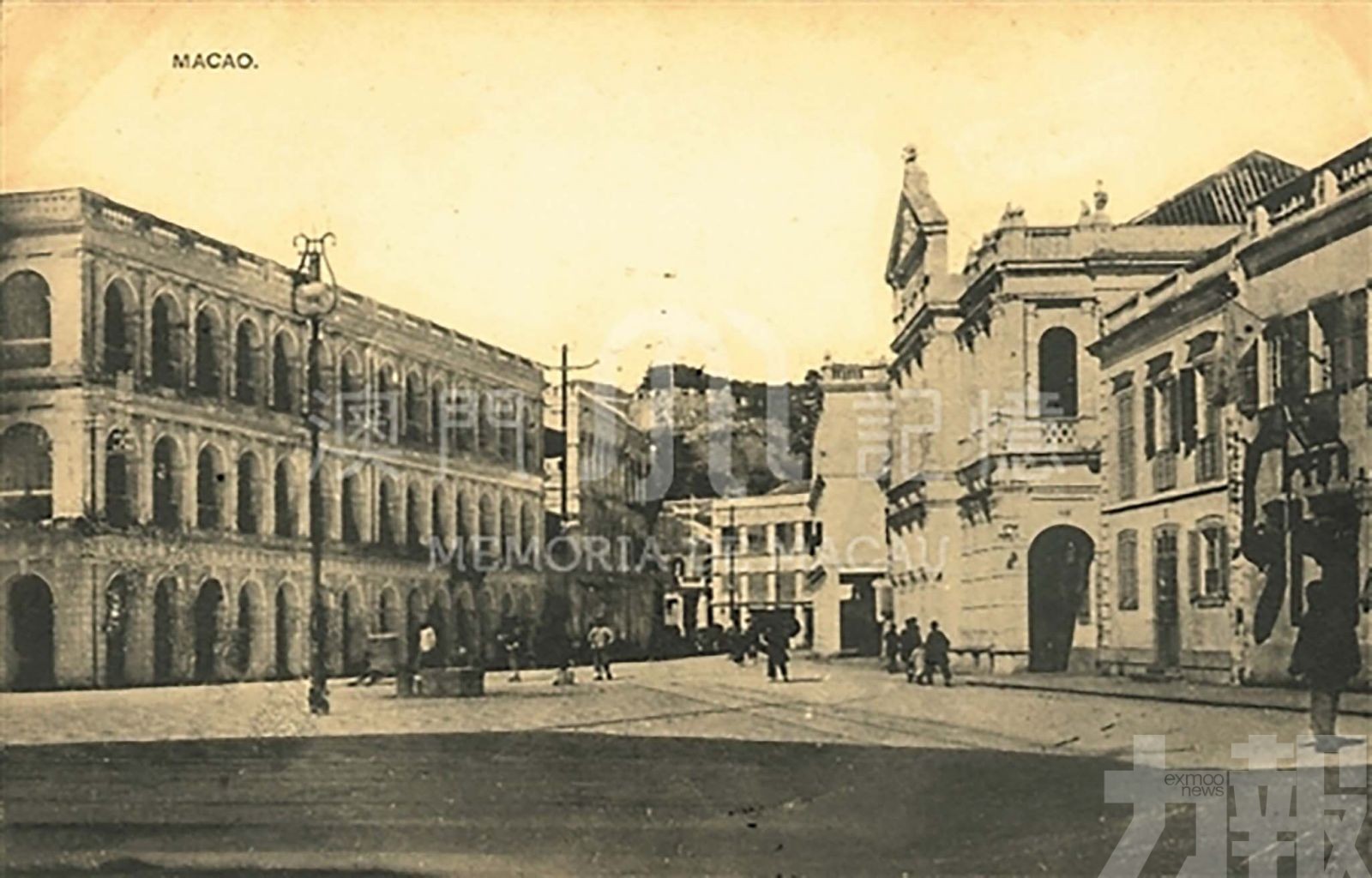 1920年代的議事亭前地,可平台上裝有街燈的電線柱。(利冠棉收臟,澳門歷史教育學會提供,摘自「 澳門記憶 」文史網)