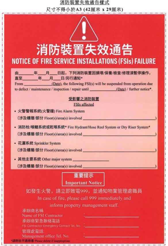 消防處通函第2/2026號則提醒承辦商,如需在進行工程前關閉任何消防裝置,必須事先評估是否會影響其他消防裝置的運作,並一併向消防處通報所有受影響範圍。承辦商須於大廈主要出入口、電梯大堂等當眼位置張貼大型通告,清晰列明裝置關閉日期、受影響範圍等資料,確保居民、物業管理公司及其他相關人士充分知悉情況,以提高居民於裝置損壞或關閉期間的消防安全意識。