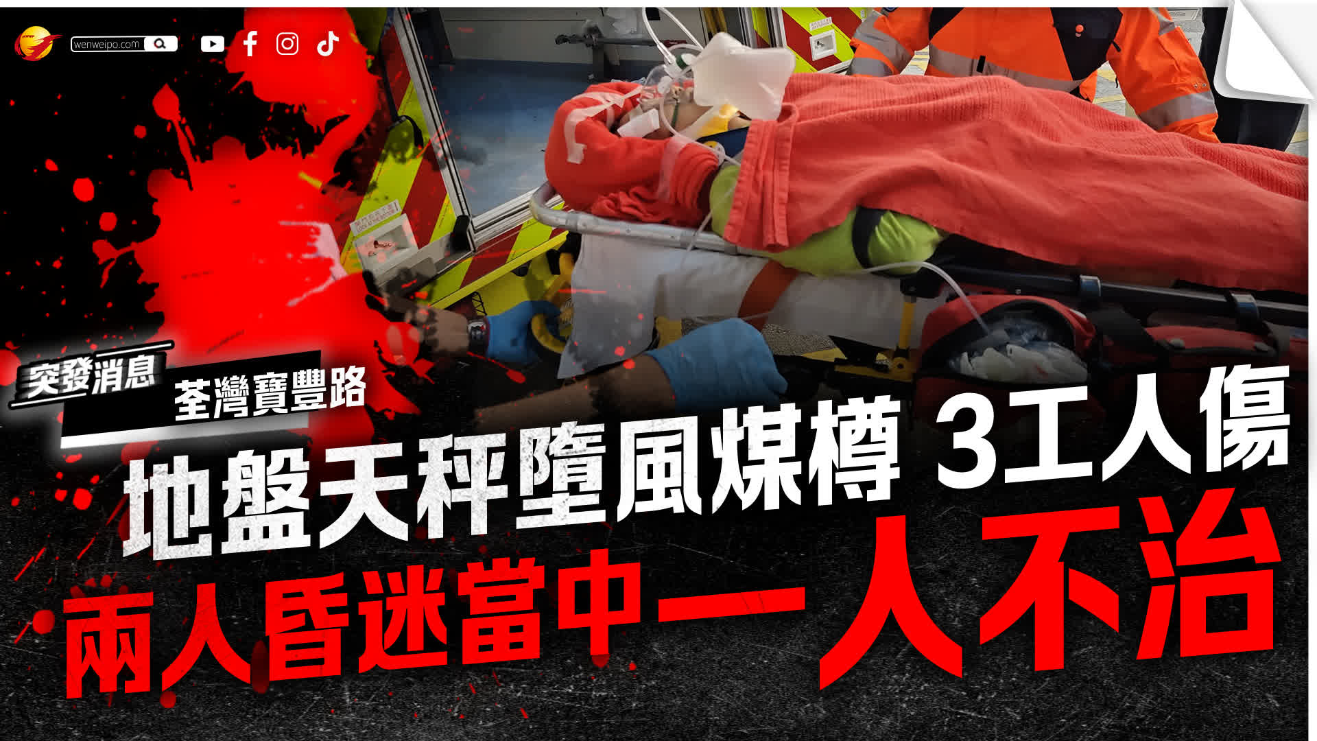 香港文匯報訊(記者 蕭景源)今日(14日)下午約1時34分,警方接報指荃灣寶豐路一地盤發生工業意外。據悉有天秤吊運風煤樽時,當中兩支氣樽突從高處墮下,3名男工人走避不及分遭擊中受傷,其中兩人昏迷。其他工友見狀立即報警,傷者其後分由救護車急送瑪嘉烈醫院及仁濟醫院救治,一人在瑪嘉烈醫院搶救無效,延至下午2時40分不治。