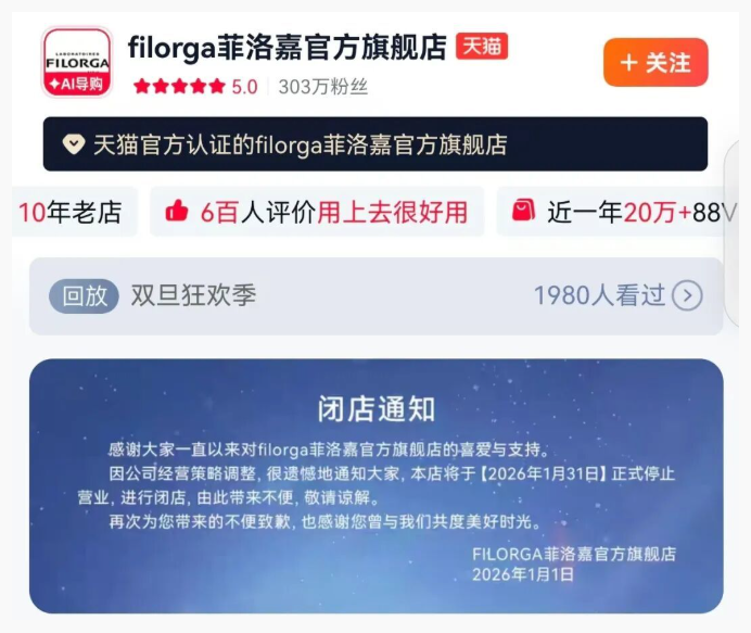 近日,法国院线护肤品牌Filorga菲洛嘉官方旗舰店发布公告称,由于公司经营策略调整,店铺将于2026年1月31日正式停止运营并闭店。截至目前,该店铺拥有303万粉丝,其明星单品“十全大补面膜”已累计售出超3万件。社交媒体上,也有消费者晒出官方店铺短信,佐证了该品牌闭店一事。