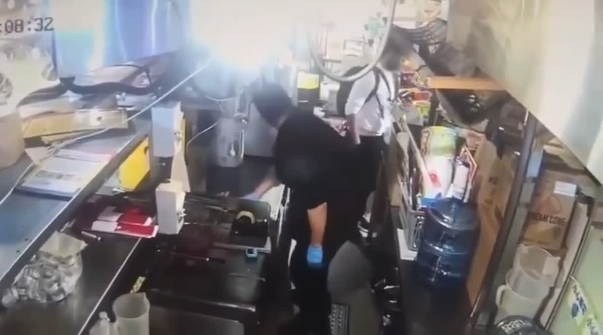 閉路電視片段顯示,晚上7時08分,一名穿黑衣的男職員,正開着水喉清洗用具。期間,身穿白衣、揹着背囊的男疑犯,突然從後面門口鬼崇進入廚房,在沒有阻攔及無視職員下,取走一把刀後便施然沿原路離去。此時,該男職員驚覺有陌生人闖入廚房及取走刀具後,隨即轉身追問,影片至此便告完結。