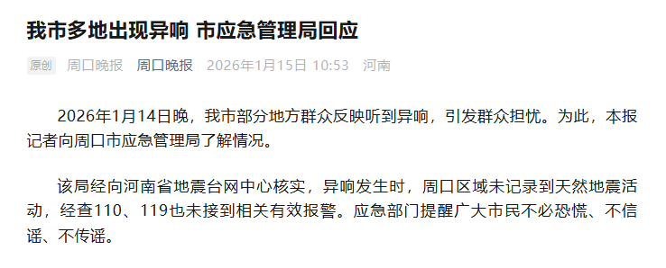 据周口晚报,1月14日晚,周口市部分地方群众反映听到异响,引发群众担忧。周口市应急管理局回应称,该局经向河南省地震台网中心核实,异响发生时,周口区域未记录到天然地震活动,经查110、119也未接到相关有效报警。应急部门提醒广大市民不必恐慌、不信谣、不传谣。