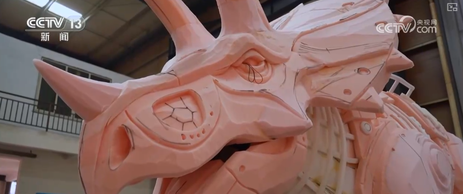 周宇健介绍,机械骨架完成过后会拉到美工车间进行泡沫海绵的附着,美工师用手里的美工刀,一刀一刀削出想要的造型。这个削特别讲究,必须要稳、准、狠,不然造型做出来就不像了。