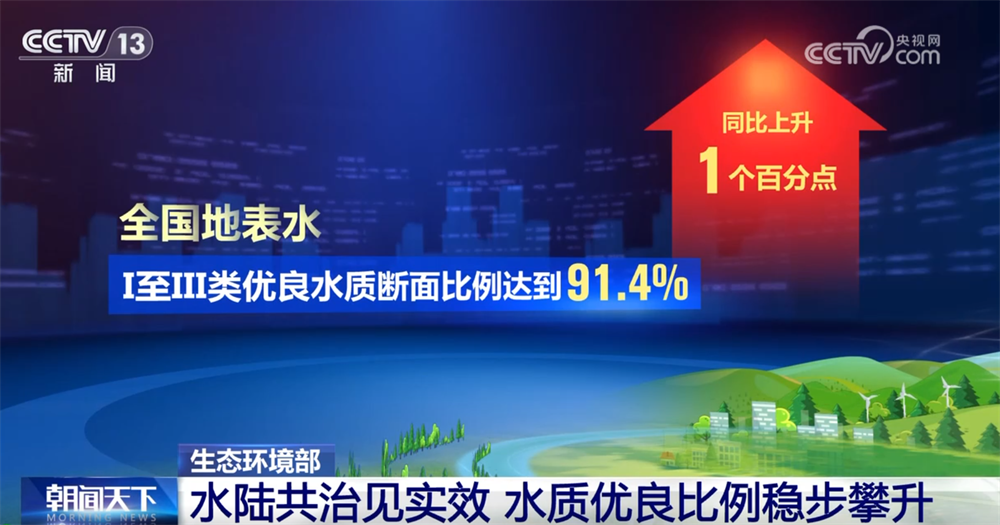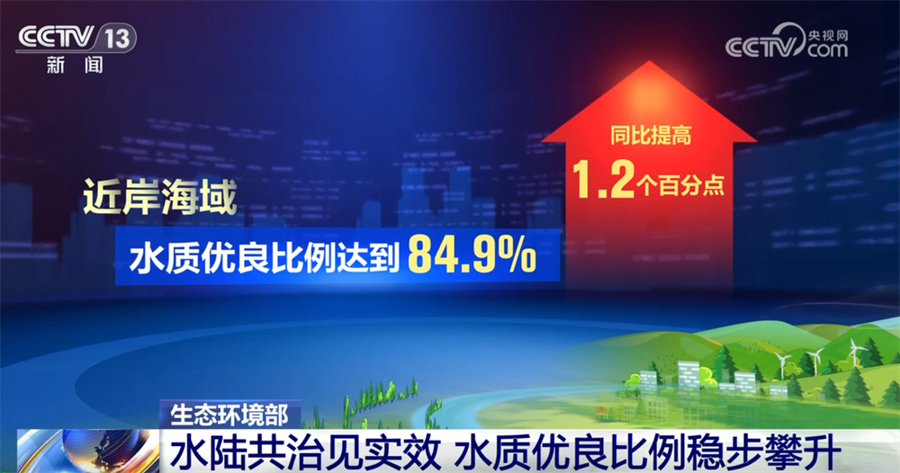 全国地表水Ⅰ至Ⅲ类优良水质断面比例达到91.4%,同比上升1个百分点;近岸海域水质优良比例达到84.9%,同比提高1.2个百分点。“十四五”期间,地表水Ⅰ至Ⅲ类水质断面比例累计上升8个百分点,长江干流连续6年、黄河干流连续4年全线水质稳定保持Ⅱ类,太湖连续2年水质达到Ⅲ类;近岸海域水质优良比例较2020年提高7.5个百分点。