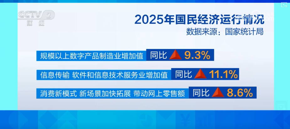 2025年,数字渗透力明显增强。规模以上数字产品制造业增加值比上年增长9.3%,信息传输、软件和信息技术服务业增加值增长11.1%。消费新模式、新场景加快拓展,带动网上零售额增长8.6%。5G、千兆光网、物联网等新型基础设施建设有序推进。