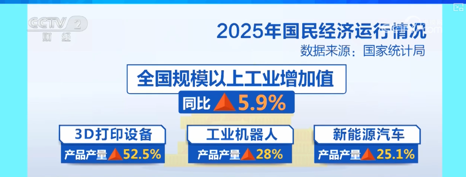 工业生产较快增长,全年全国规模以上工业增加值比上年增长5.9%。装备制造业和高技术制造业增势较好。3D打印设备、工业机器人、新能源汽车产品产量分别增长52.5%、28%、25.1%。