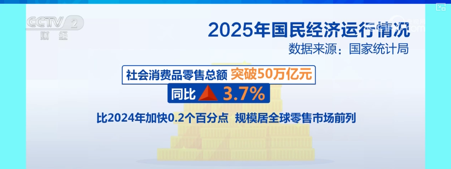 数据显示,2025年,社会消费品零售总额突破50万亿,同比增长3.7%,比2024年加快0.2个百分点,规模居全球零售市场前列。