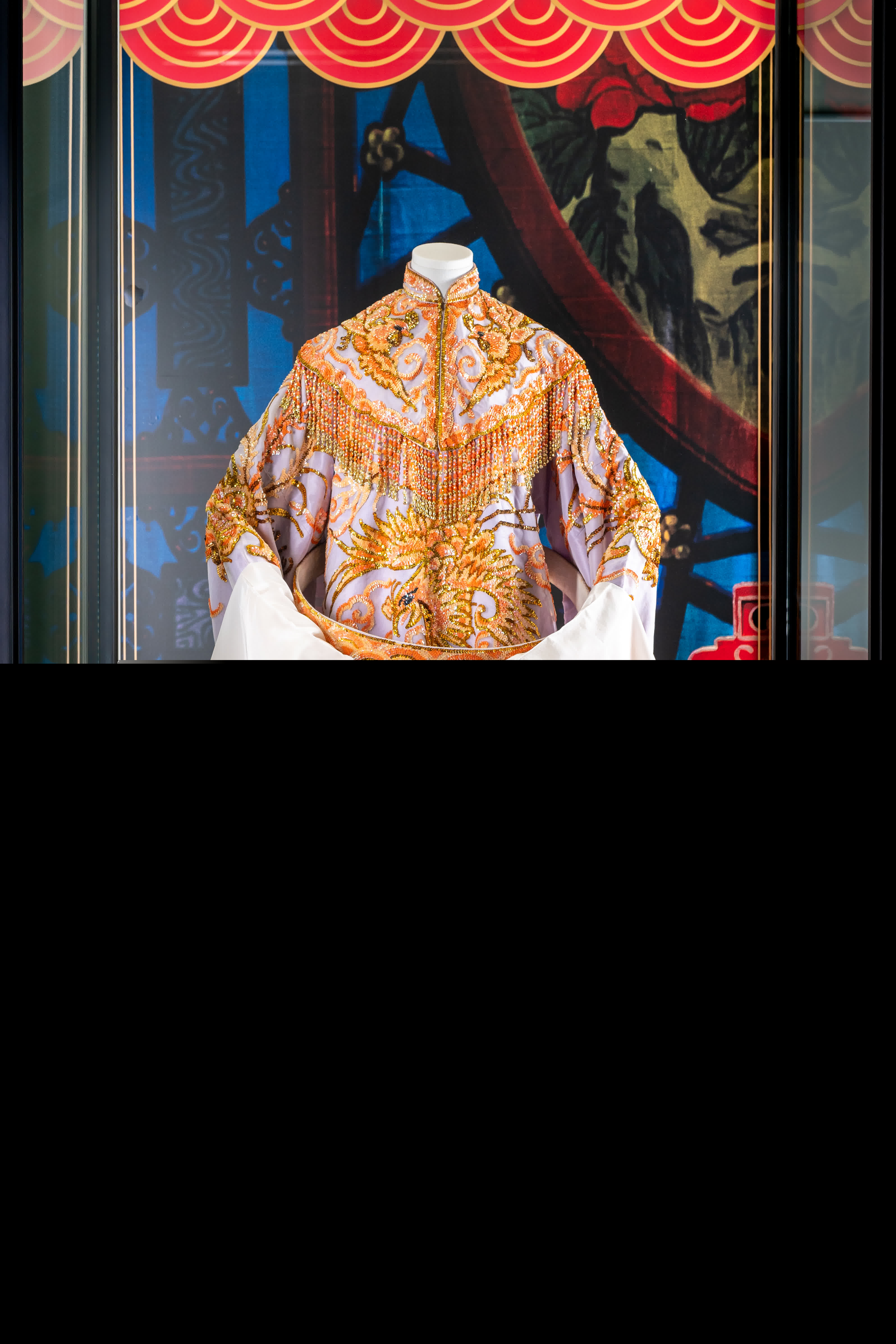 焦點展品包括兩件珍貴的「女蟒」(后妃在朝會大典穿著的官禮服),分別是芳艷芬於1994年聯同李曾超群為香港醫學專科學院慈善演出折子戲《紅綾配》時穿著的戲服,以及陳好逑在1960至70年代登台演出時穿用的粉紫地橙金片女蟒,兩者刺繡細膩,手工卓絕。