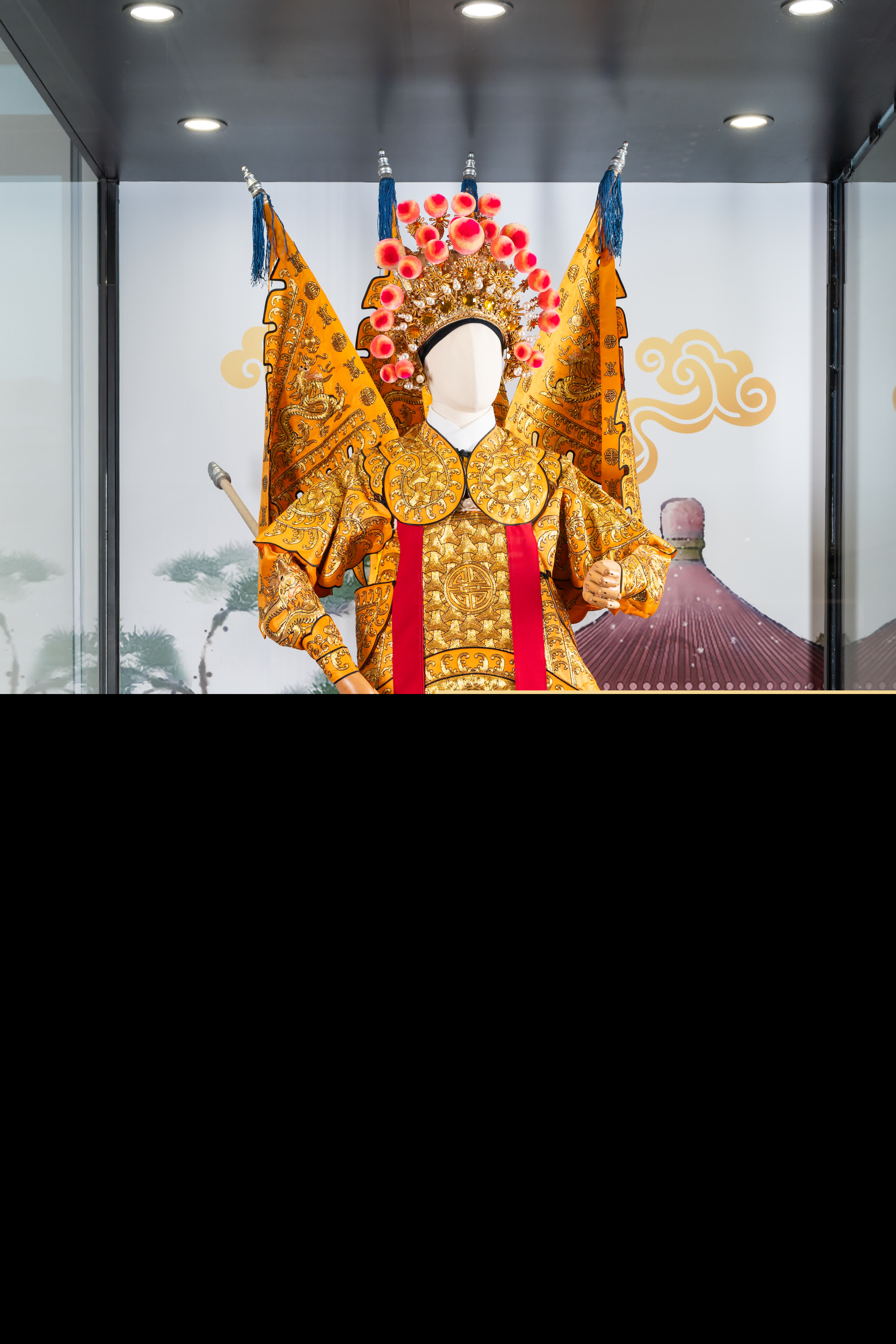 著名粵劇老倌龍貫天亦借出兩件珍藏戲服參展。他分享這是演出經典名劇《胡不歸》所穿的「白底橙金顧繡小靠」,並提到所戴的「西盔」融合西方古代帽飾特色,體現粵劇服飾的獨特風格。另一件橙色顧繡「大靠」是傳統戲中武將、元帥穿著的戰袍,龍貫天曾穿著它演出《隋宮十載菱花夢》等多個劇目。這套戲服結構繁複,背部插有四支靠旗,配搭的大額子亦一同展出。他形容戲服是「傳統工藝的結晶」,期望公眾透過展覽了解戲服背後的文化與故事,並呼籲各界持續支持粵劇發展。