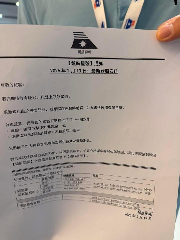 麗星郵輪回覆傳媒查詢時表示,遺憾宣布原定於2月13日由香港海運碼頭出發的「領航星號」2晚公海航次因突發技術問題而取消。受影響的乘客已獲個別通知,船公司正提供必要的協助及賠償。船公司對是次取消造成的不便深表歉意,並正積極為所有受影響的乘客提供支援。受影響的乘客現可選擇多項靈活安排,包括更改航程或獲取全額退款。麗星郵輪強調,一直堅定致力為乘客提供安全及愉悅的旅遊體驗,感謝乘客及合作夥伴在此期間的理解與耐心。