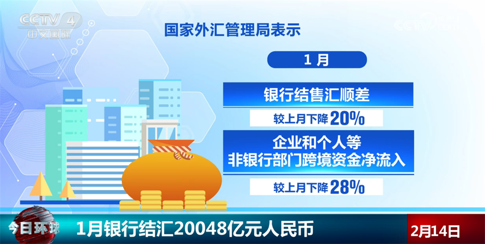 国家外汇管理局表示,1月,银行结售汇顺差、企业和个人等非银行部门跨境资金净流入较上月分别下降20%和28%。受季节性等因素影响,岁末年初企业收款和结汇增加较快,随着需求逐步释放,近期企业收款和结汇增长放缓。从主要渠道看,1月,货物贸易项下资金净流入较上月下降27%,服务贸易项下资金净流出增长23%,证券投资项下资金净流入保持稳定。总的来看,我国外汇市场交易活跃、预期平稳,跨境资金流动更趋稳定。