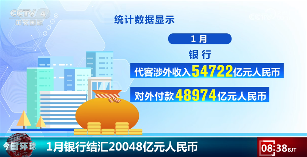 统计数据显示,2026年1月,银行结汇20048亿元人民币,售汇14457亿元人民币。1月,银行代客涉外收入54722亿元人民币,对外付款48974亿元人民币。