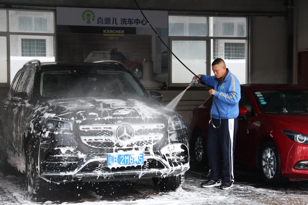 在位于深圳市福田区的喜憨儿洗车中心,心智障碍青年正在认真地清洗车辆(2月11日摄)。新华社记者梁旭 摄