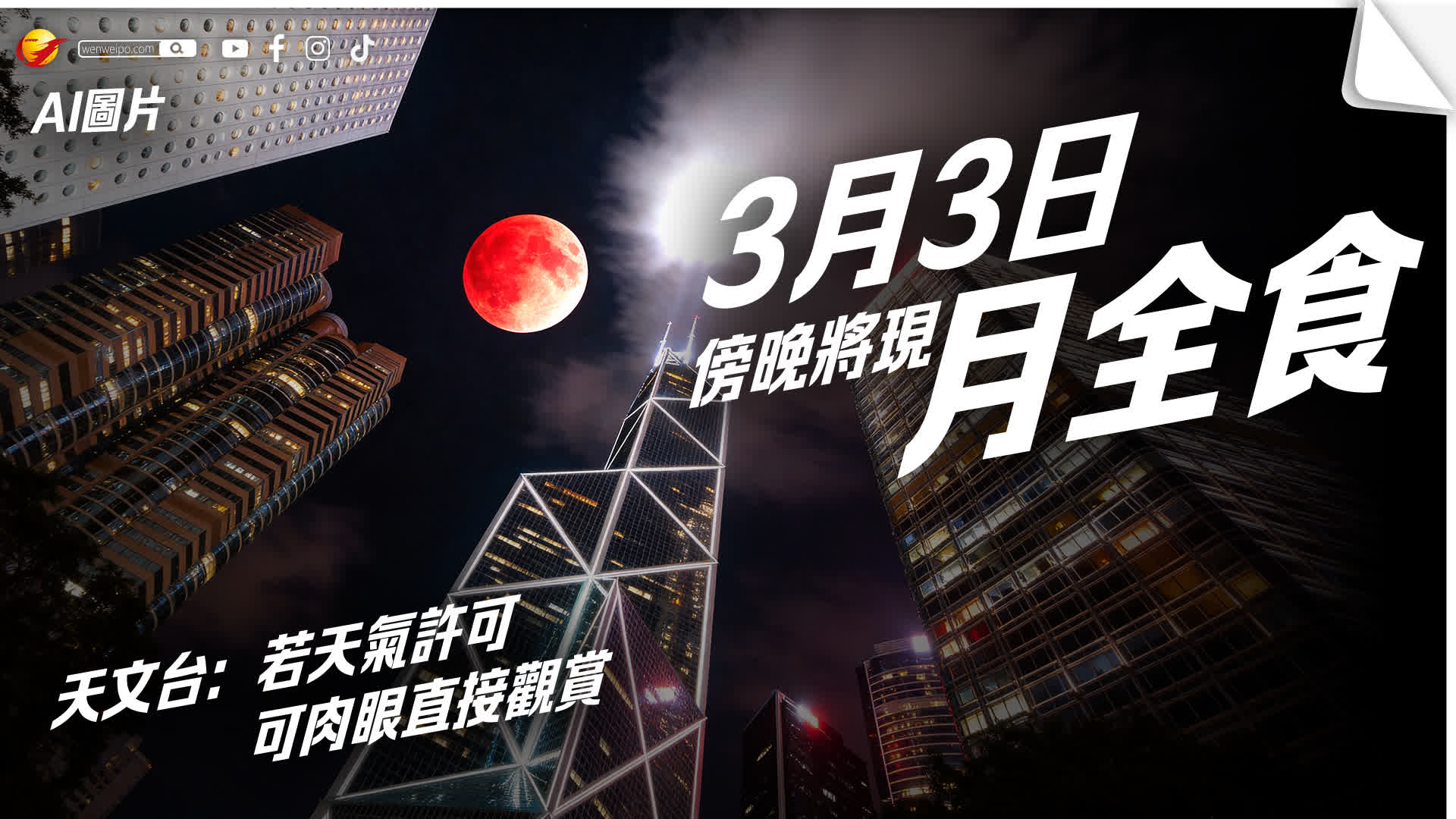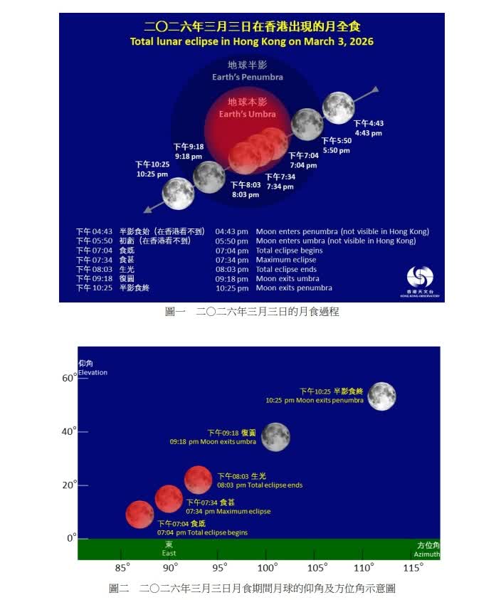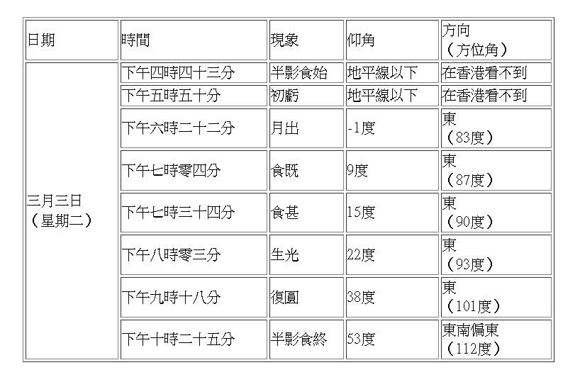 香港文匯報訊(記者 蕭景源)香港上空3月3日(星期二)傍晚將出現月全食。若天氣情況許可,市民可以肉眼直接觀賞月全食過程,面向東方而沒有障礙物的地點都適合觀賞這次月食。