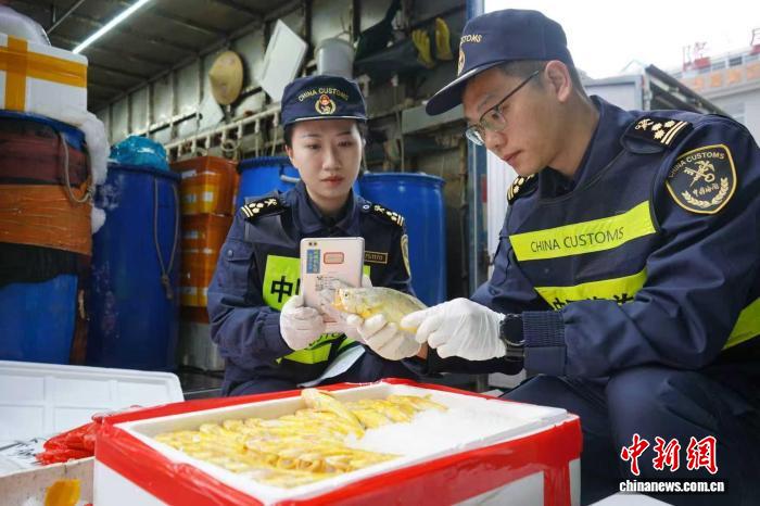 拱北海关所属香洲海关关员现场查验供港澳水产品通关。陈淳彬 摄25日是年初九,天还未亮,加工配送中心内热火朝天,分拣、称重、打包,新鲜捕捞的水产品快速完成加工、装运,等待出境运往澳门。