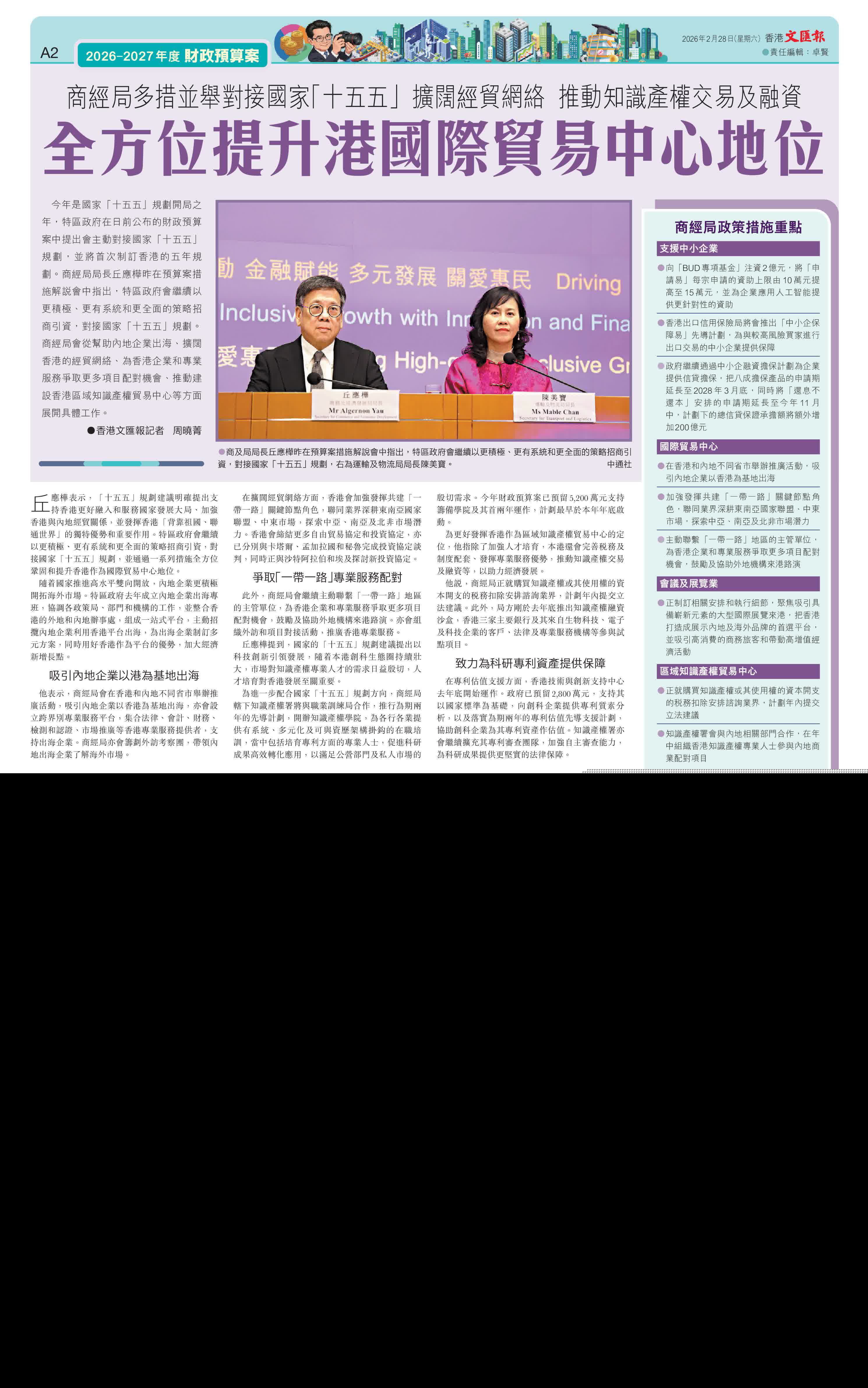 (香港文匯報記者 周曉菁)今年是國家「十五五」規劃開局之年,特區政府在日前公布的財政預算案中提出會主動對接國家「十五五」規劃,並將首次制訂香港的五年規劃。商經局局長丘應樺昨在預算案措施解說會中指出,特區政府會繼續以更積極、更有系統和更全面的策略招商引資,對接國家「十五五」規劃。商經局會從幫助內地企業出海、擴闊香港的經貿網絡、為香港企業和專業服務爭取更多項目配對機會、推動建設香港區域知識產權貿易中心等方面展開具體工作。