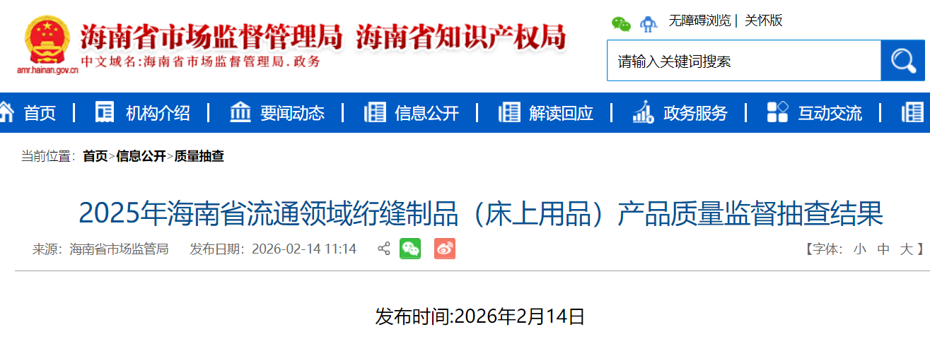2025年第4季度,海南省市场监督管理局对全省流通领域绗缝制品(床上用品)产品进行了监督抽查。本次抽查了30批次产品,经检验,不合格8批次,不合格发现率为26.7%。