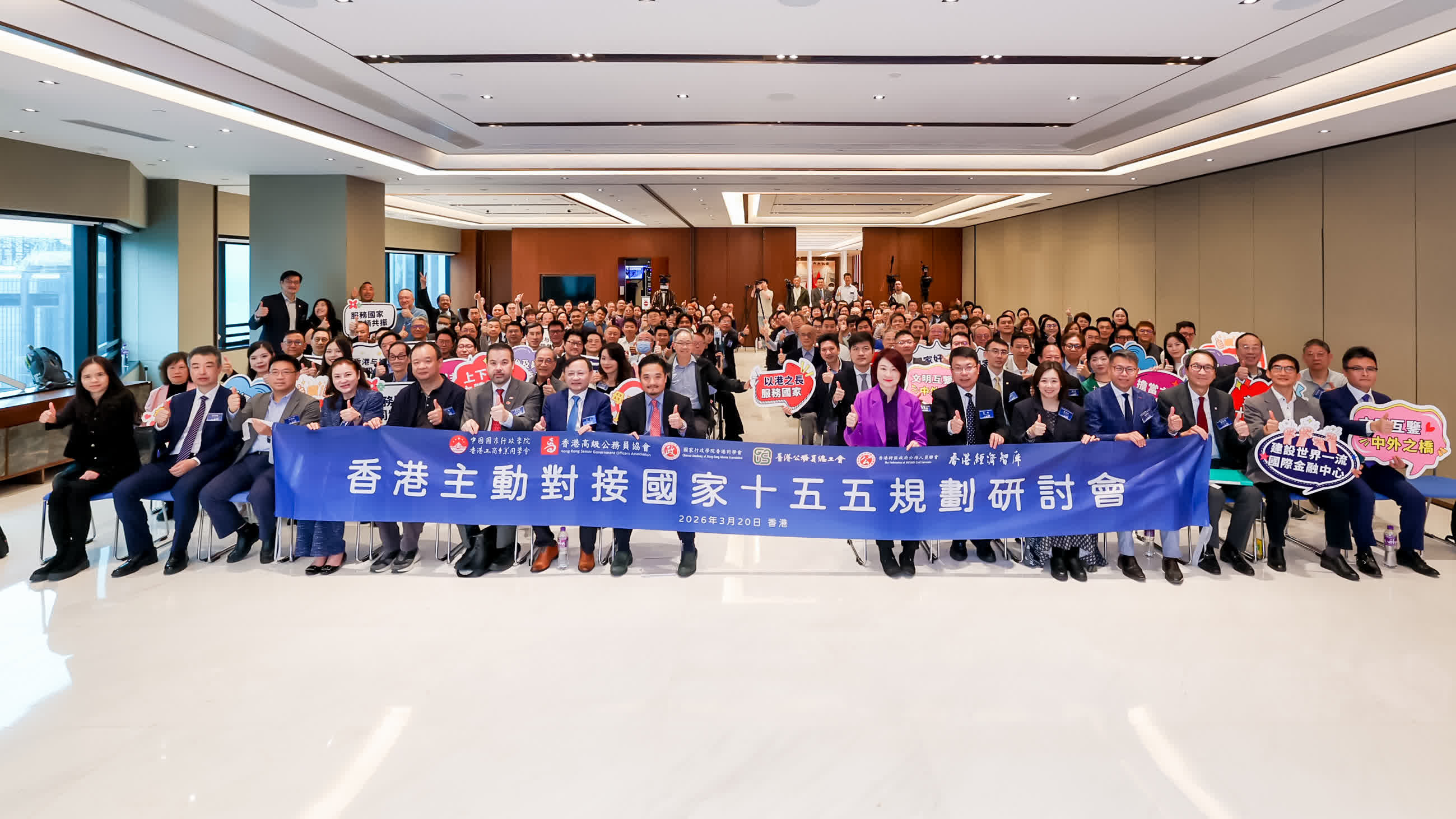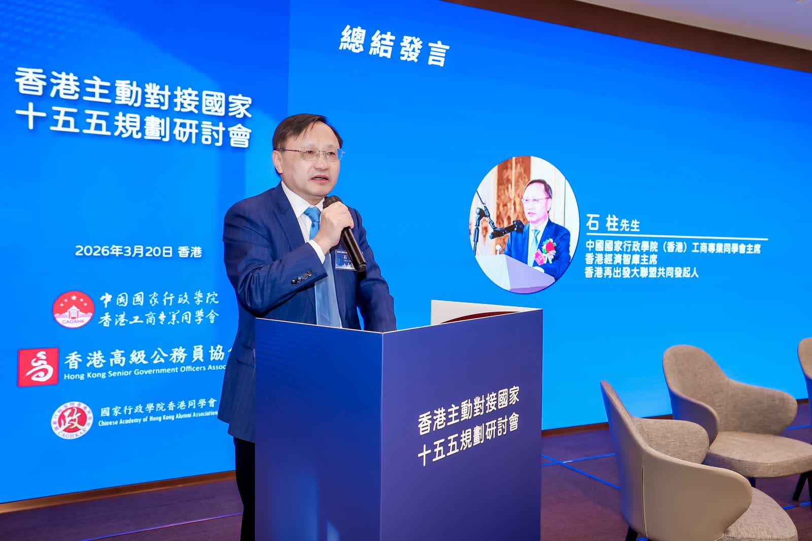 由中國國家行政學院(香港)工商專業同學會、香港高級公務員協會、國家行政學院香港同學會、香港公務員總工會、香港特區政府公務人員聯會、香港經濟智庫聯合主辦、230位香港政界和工商界代表出席的「香港主動對接國家『十五五』規劃研討會」3月20日在香港舉行,石柱在會上發出上述呼籲。全國人大常委、香港立法會主席李慧琼,香港特區政府特首政策組組長黃元山,香港中聯辦經濟部副部長呂峰擔任主禮嘉賓。
