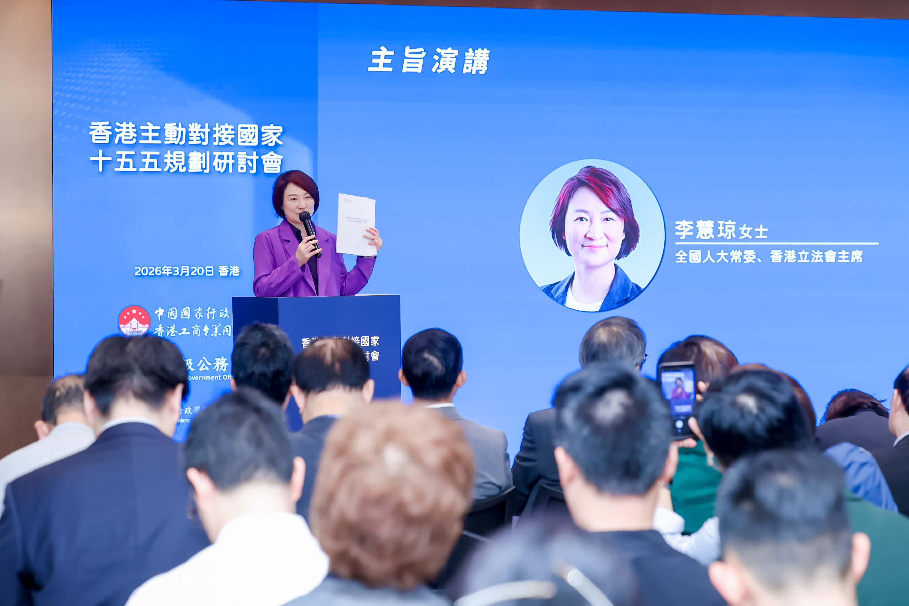 李慧琼在主旨演講中分享了香港對接國家「十五五」規劃的核心要點與全新視角,其核心價值觀點如下:一是國家「十五五」規劃港澳篇章為歷屆分量最重,體現中央對港重視與支持;二是規劃用詞從「保持」香港繁榮穩定變為「促進」,從單提「融入」到強調「融入+服務」,要求香港更主動發揮優勢助力國家發展;三是國家規劃目標清晰且配套具體,109項重大專案明確了新型產業、前沿科技等發展方向,香港各界可對標布局;四是習主席兩會講話凸顯經濟發展、健康中國、國家安全三大核心,為香港對接規劃指明方向;五是呼籲香港社會積極參與本地五年規劃意見徵集,各界需結合自身優勢找準定位,成為國家規劃的貢獻者、建設者,最終共用發展成果。