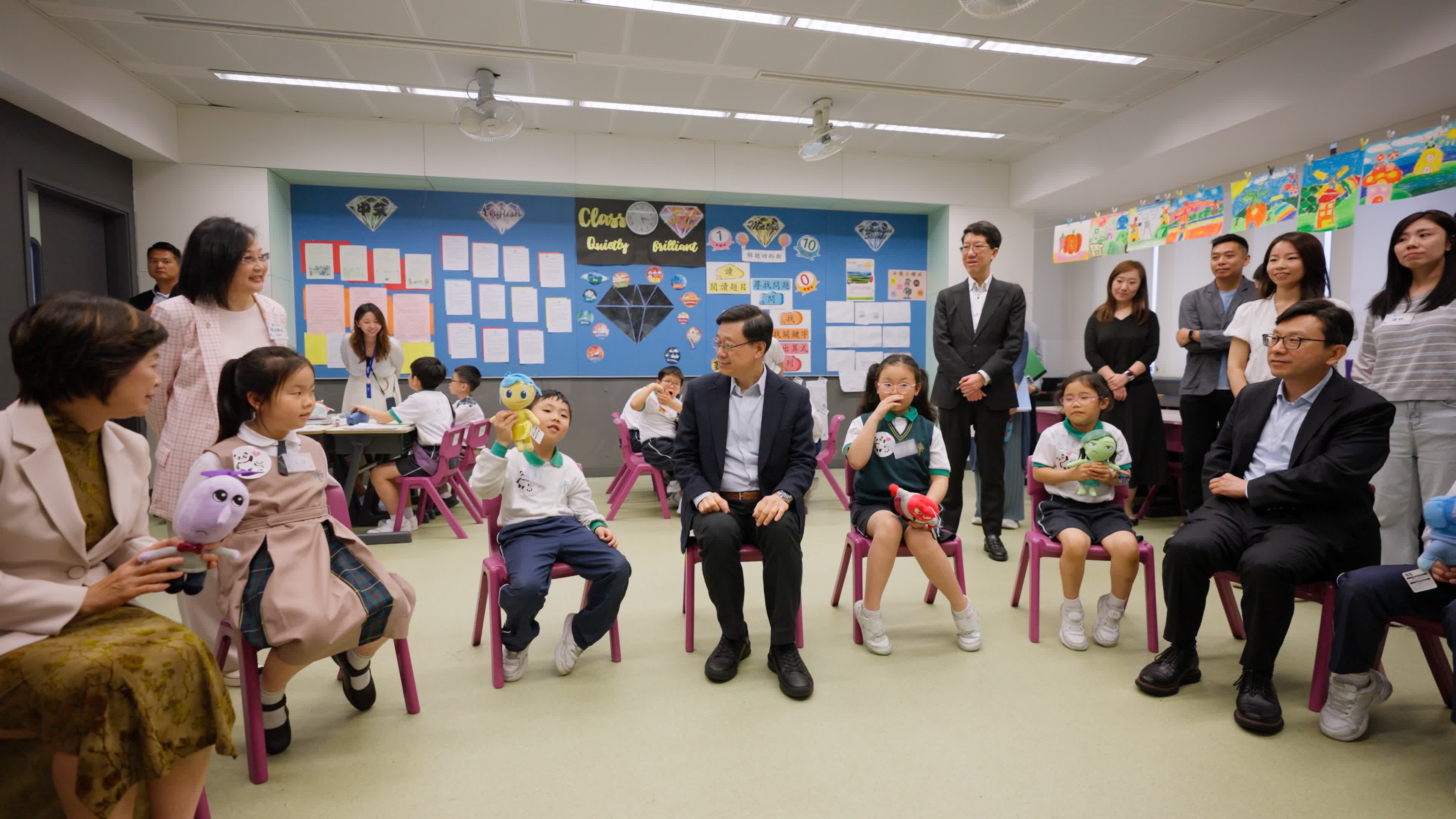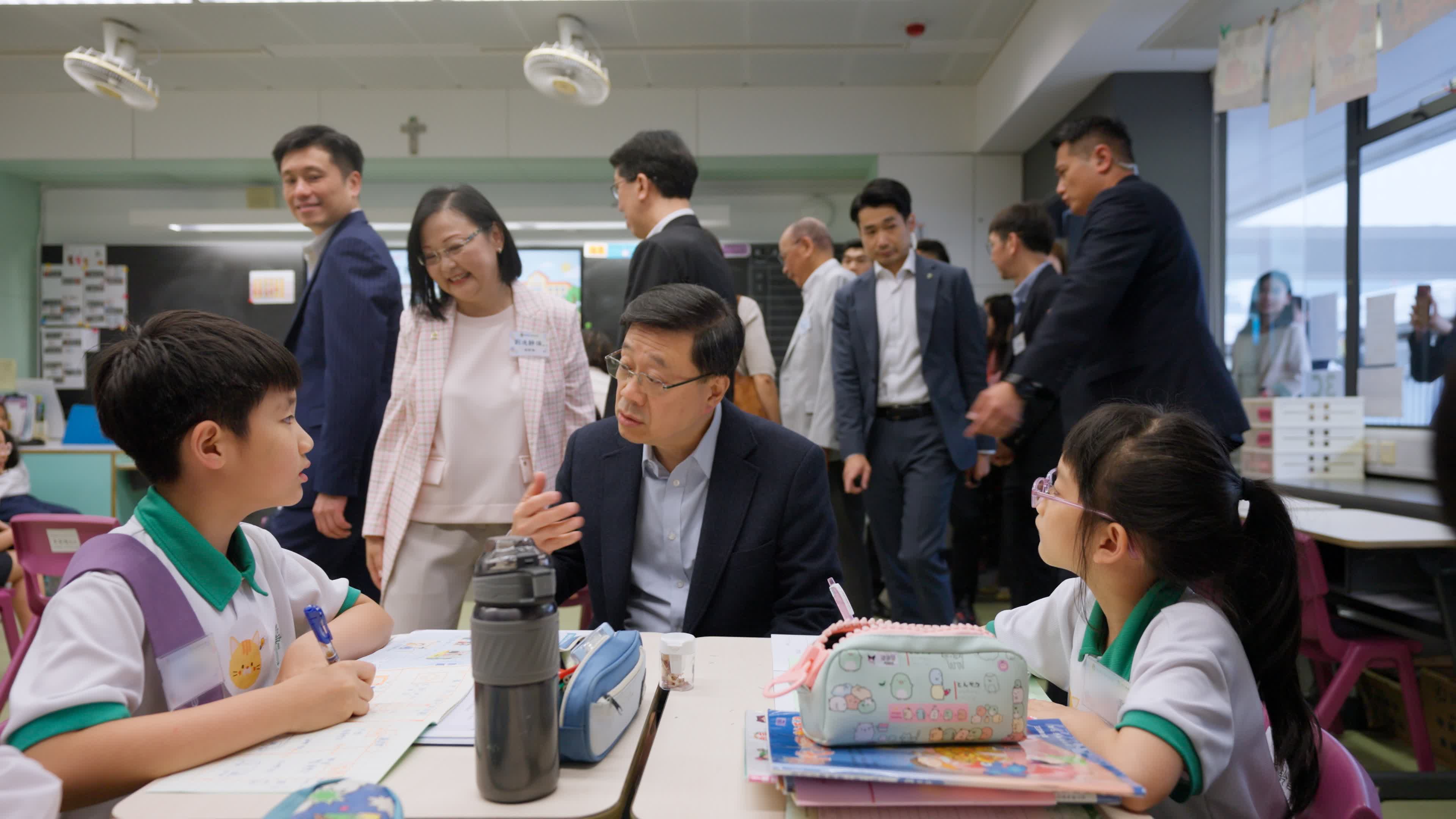李家超到訪的學校夥拍非政府機構正推行「在校課後託管服務計劃」,順道視察計劃運作情況。參與計劃的學生放學後,在導師指導下完成功課及溫習,亦會進行遊戲及課外活動。他觀看了導師為學生作繪本講解,又在他們進行躲避盤遊戲時參與其中。
