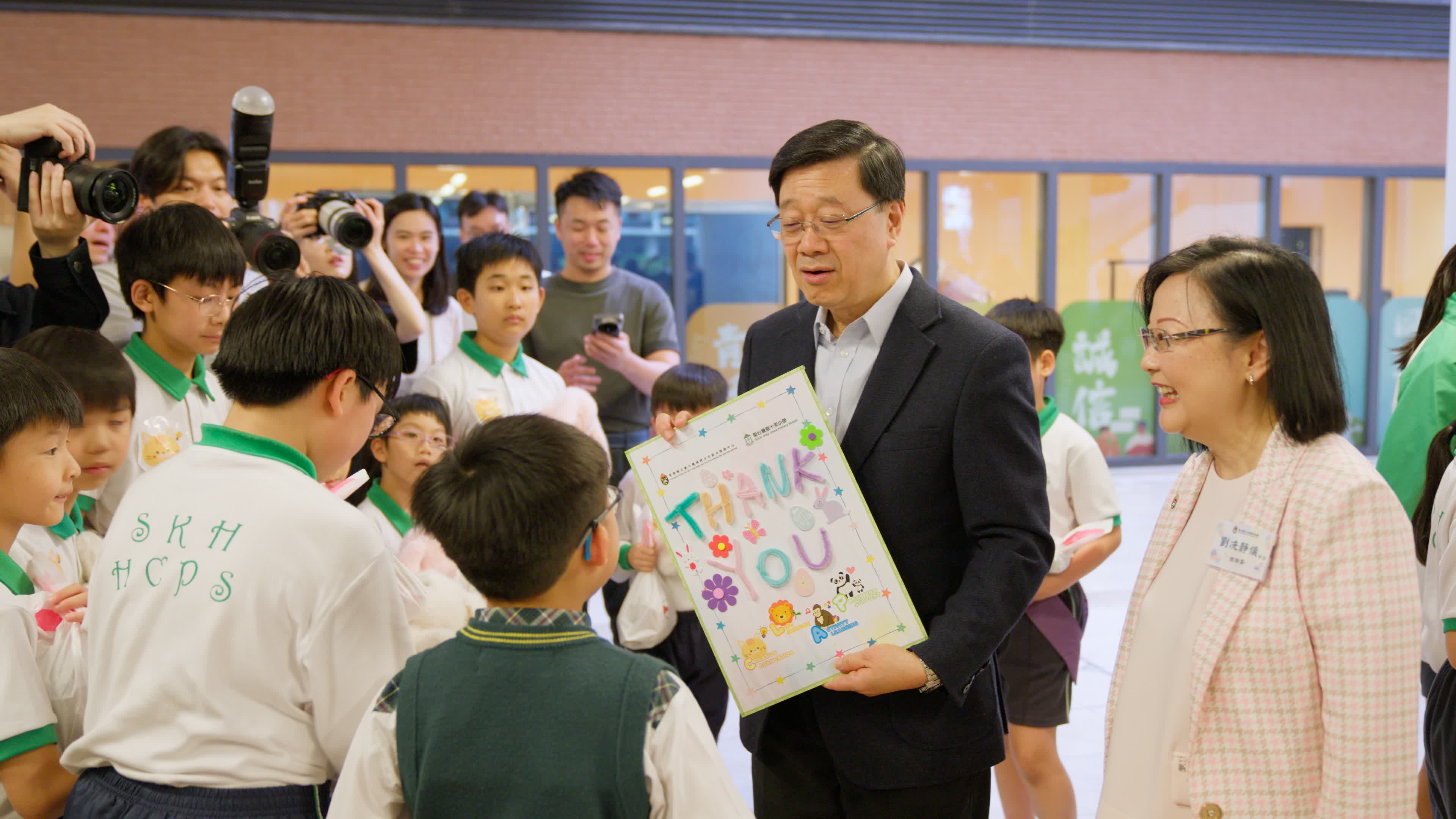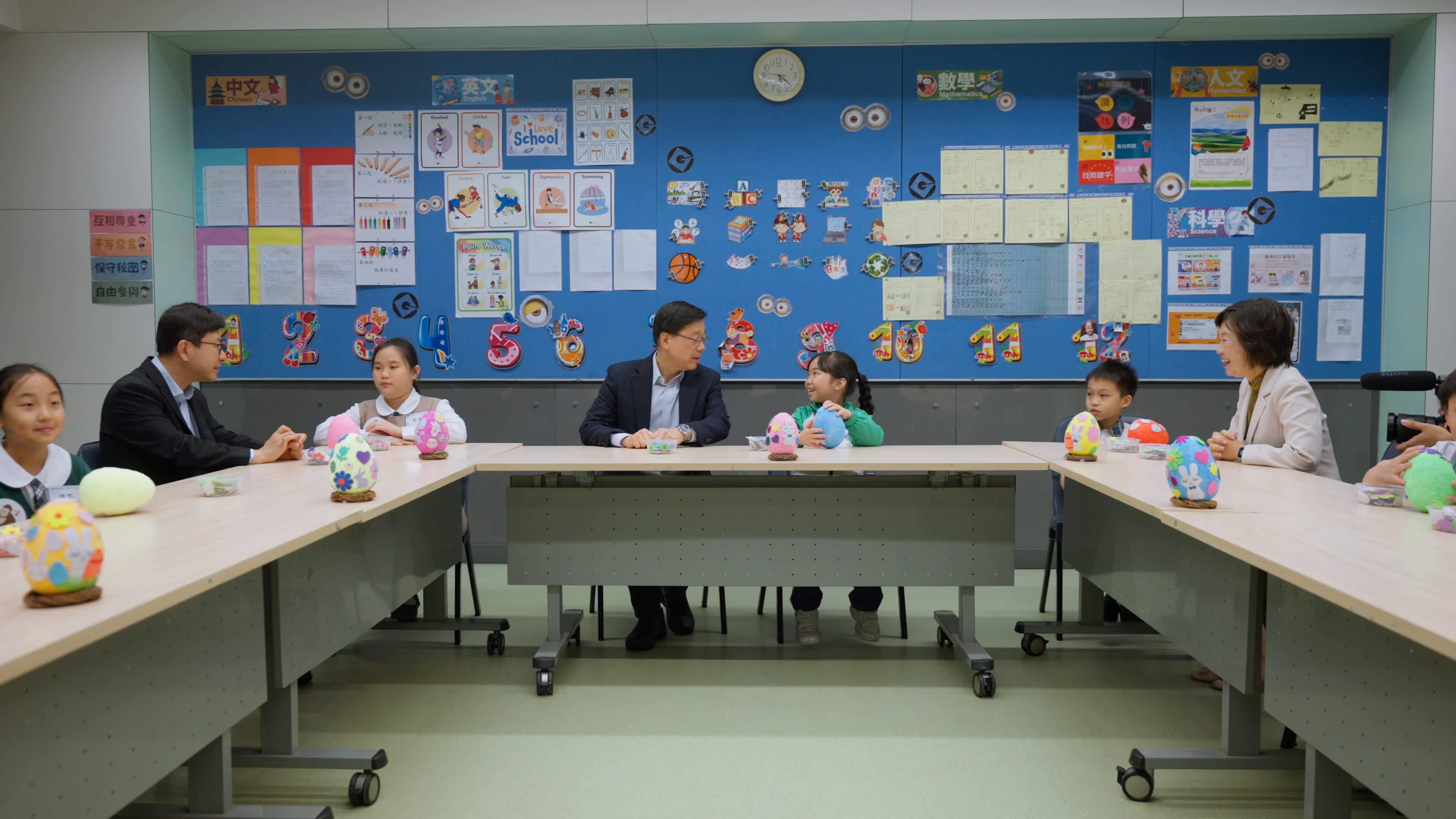 行政長官李家超在社交平台上發文表示,日前與教育局局長蔡若蓮及勞工及福利局局長孫玉菡到訪九龍城區一間小學,與同學們一起迎接復活節假期來臨。除與同學們一起製作復活蛋外,也為他們送上復活兔及禮物包,為將至的長假期增添節日氣氛。