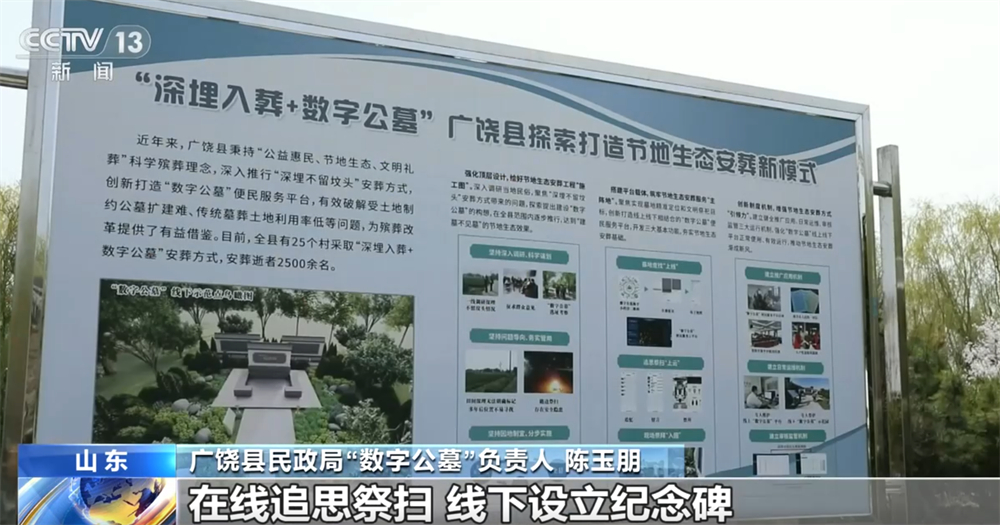 山东省广饶县民政局“数字公墓”负责人陈玉朋介绍,线上开发微信小程序,家属可以通过定位找到公墓的位置在线追思祭扫,线下设立纪念碑,为群众提供了一个固定的文明祭扫的场地。“深埋入葬+数字公墓”的安葬模式已节约土地200余亩。