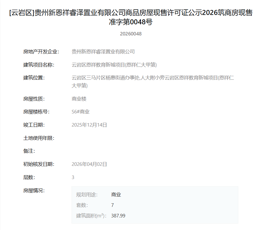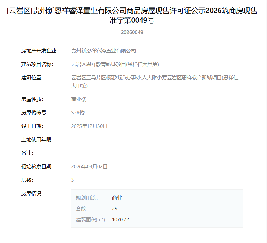 4月7日,据筑房网消息,贵州新恩祥睿泽置业有限公司开发的“云岩区恩祥教育新城项目(恩祥仁大甲第)”新增两栋商业楼获得现售许可。新获批销售的房源为S3#楼与S6#商业楼,许可证号分别为2026筑商房现售准字第0049号与0048号。