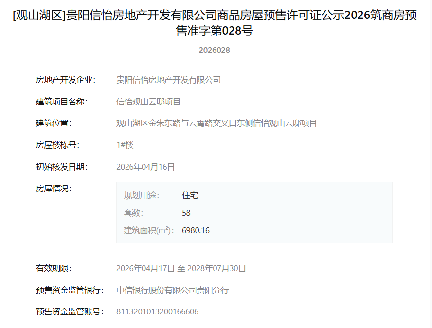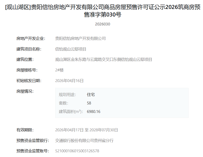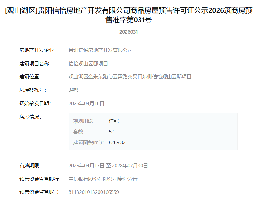 4月17日,据筑房网消息,贵阳信怡房地产开发有限公司开发建设的“信怡观山云邸”项目1#、2#、3#楼商品房屋预售许可证集中核发,标志着该项目首批住宅正式获准上市销售。