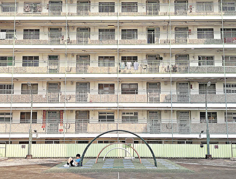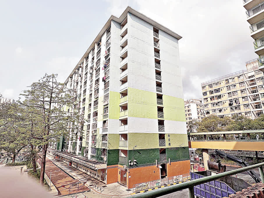 於1977年落成的南山邨,至今有近50年的歷史,當中的「南山」取自「福如東海,壽比南山」,寄託着當時人們福壽綿長的願望。建築外牆被粉刷成清新的藍、綠、橙色,為千篇一律的鋼筋水泥建築增添活力。南山邨最為人所熟知的一定是南樂樓的打卡點,這個寬闊的空中平台被三座大樓包圍其中,左右兩邊分別設有舊式兒童遊樂場,有一種鬧中取靜之感。當中三個由小至大排列的拱形鐵梯,與背後的大樓一同形成完美的對稱結構,十分出片。
