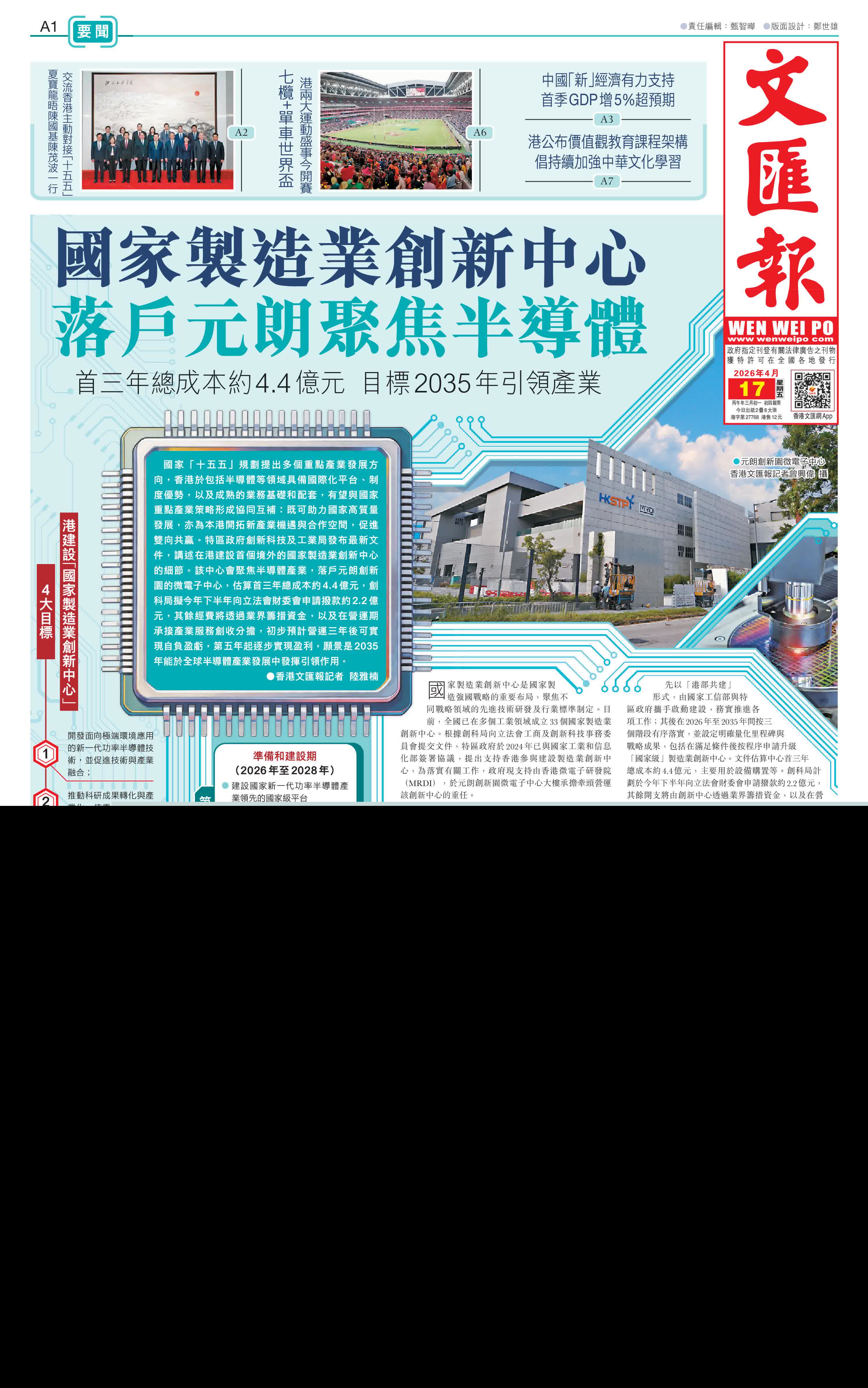 香港文匯報訊(記者 陸雅楠)國家「十五五」規劃提出多個重點產業發展方向,香港於包括半導體等領域具備國際化平台、制度優勢,以及成熟的業務基礎和配套,有望與國家重點產業策略形成協同互補:既可助力國家高質量發展,亦為本港開拓新產業機遇與合作空間,促進雙向共贏。特區政府創新科技及工業局發布最新文件,講述在港建設首個境外的國家製造業創新中心的細節。該中心會聚焦半導體產業,落戶元朗創新園的微電子中心,估算首三年總成本約4.4億元,創科局擬今年下半年向立法會財委會申請撥款約2.2億元,其餘經費將透過業界籌措資金,以及在營運期承接產業服務創收分擔,初步預計營運三年後可實現自負盈虧,第五年起逐步實現盈利,願景是2035年能於全球半導體產業發展中發揮引領作用。