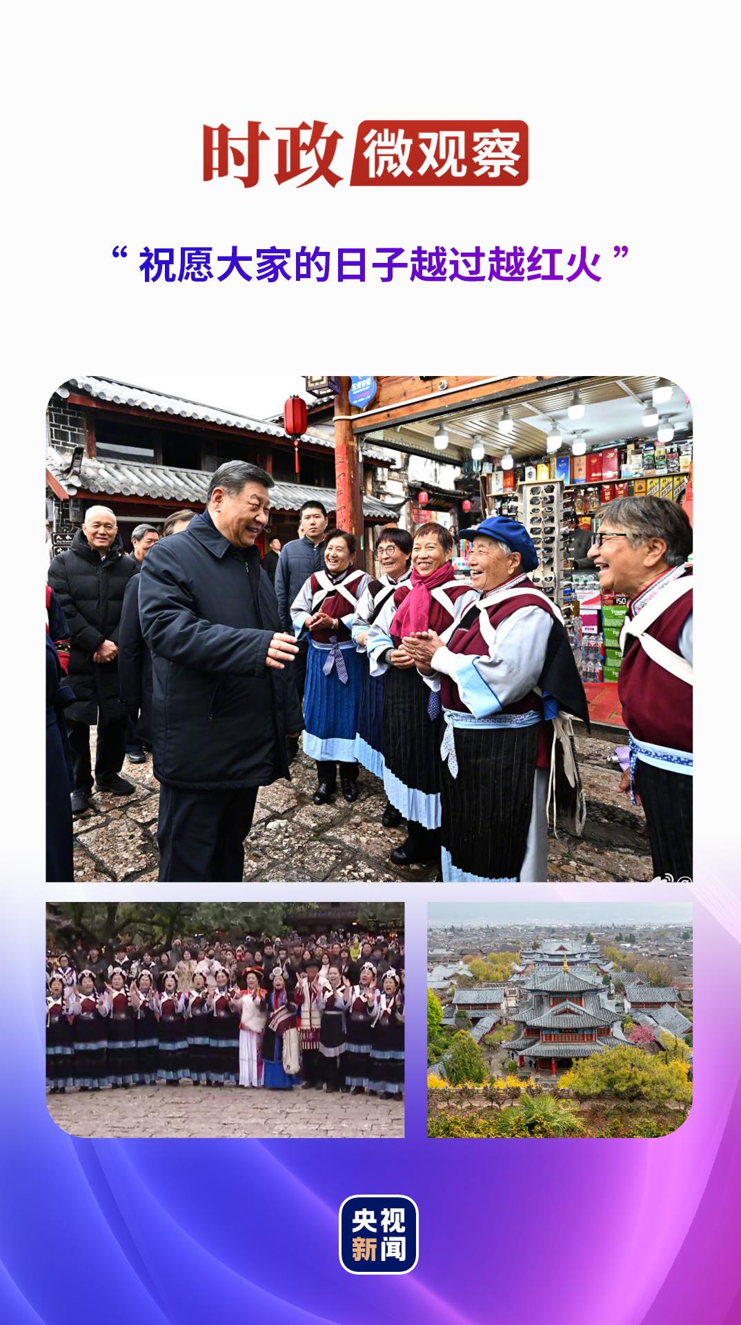 On March 19 this year, General Secretary Xi Jinping came to Yunnan again for inspection, walked along the stone road in the ancient city of Lijiang, and stopped from time to time to communicate with everyone. The residents and tourists from the ancient city were very excited when they saw the General Secretary and rushed to say hello. Some even played musical instruments and sang and danced to welcome the General Secretary. General Secretary Xi Jinping wishes everyone, "I hope your life will be happy and healthy, just like the Naxi tribe's surname, harmonious and beautiful."