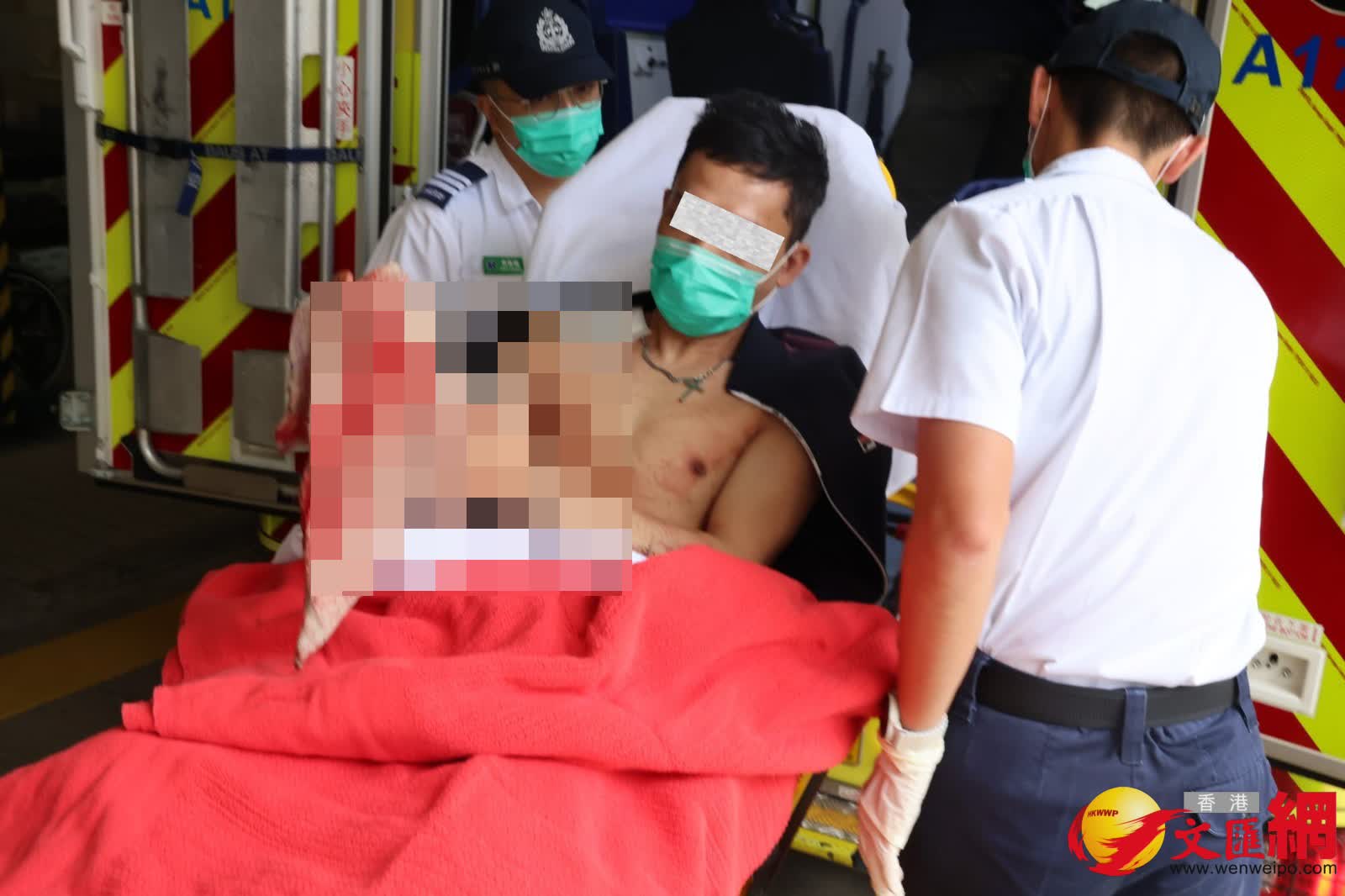 被捕兩人送院時,其中一名雙手鎖上手銬被捕人,其頸項、手臂及姆指受傷,需要用毛巾包裹止血,但見整塊毛巾染滿鮮血;另一名被捕人,則前額及左前臂受傷,自行步落救護車進入醫院。
