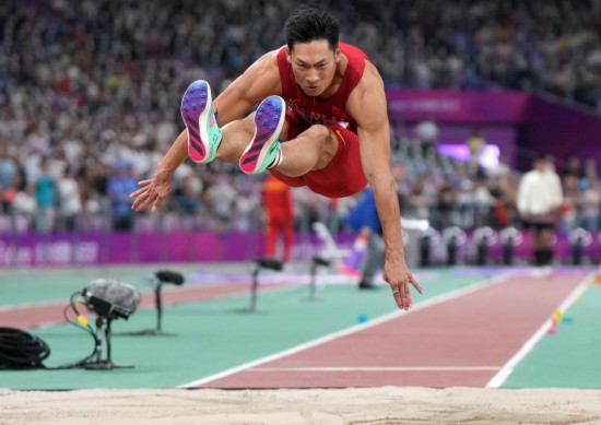2023年10月1日,中国选手石雨豪在比赛中。当日,杭州亚运会田径项目男子跳远决赛在杭州奥体中心体育场举行。新华社记者 李一博 摄