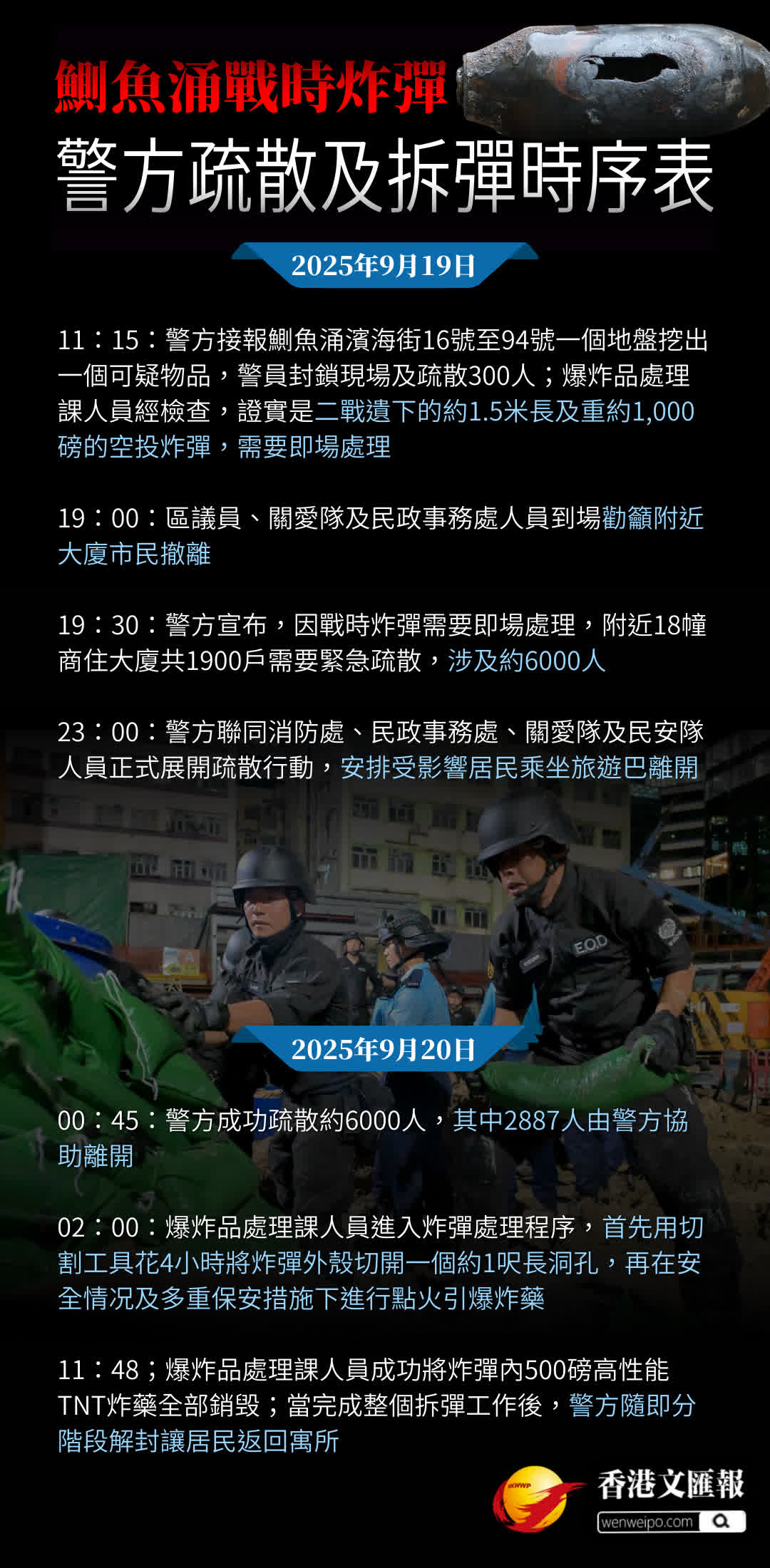 香港文匯報訊(記者 蕭景源)鰂魚涌濱海街16號至94號一個地盤,昨日(19日)工人進行地基挖掘工程時,挖出一個二戰遺下的約1.5米長及重約1,000磅的空投炸彈,當中含有500磅高性能TNT炸藥,有極高危險性。警方拆彈專家須現場切割和銷毀炸藥,為保障公眾生命和財產,警方疏散附近18幢大廈1,900戶共6,000居民,並通宵處理炸彈。至今日(20日)近中午,爆炸品處理課人員完成拆彈工作,現場分階段解封;整個過程涉及詳細檢查、疏散6000人、多重安全準備措施、複雜引爆程序,能僅以24小時完成,充分反映人員高效專業及市民質素。警方處理戰時炸彈時序如下