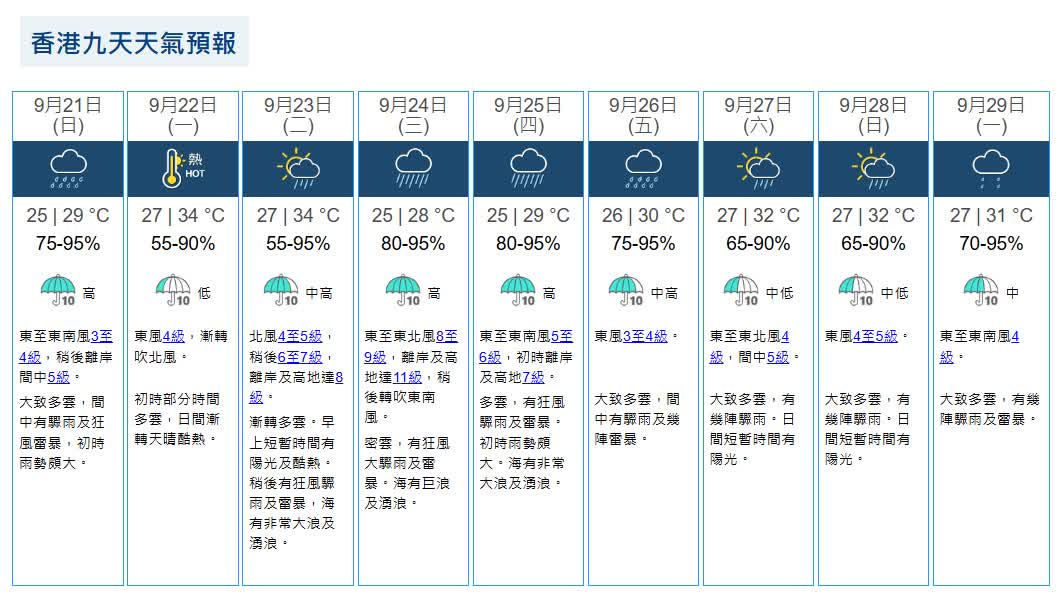 本港地區今日天氣預測大致多雲,間中有驟雨及狂風雷暴,初時雨勢頗大。最高氣溫約29度。吹和緩東至東南風,稍後離岸風勢間中清勁。展望明日天色短暫好轉及酷熱。隨後一兩日天氣逐漸轉壞。星期三吹烈風至暴風,天氣惡劣,有狂風大驟雨及顯著風暴潮。