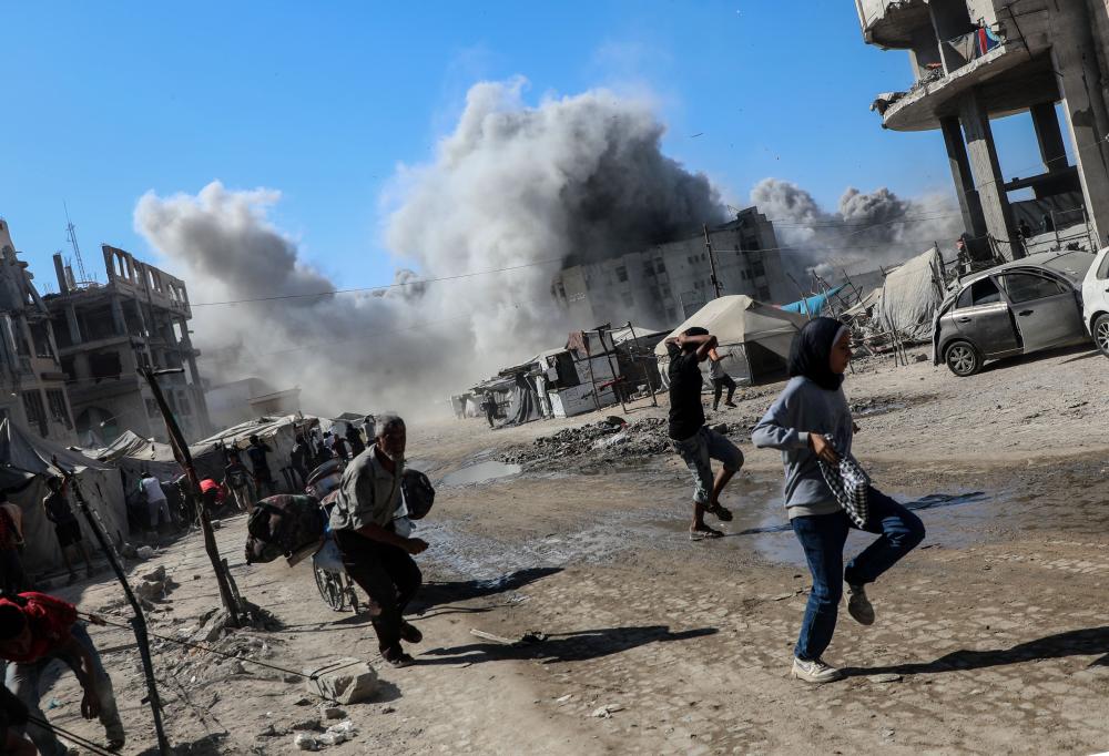9月8日,加沙城一座高层建筑遭以色列军队空袭后升起浓烟,民众纷纷躲避。新华社发(里泽克·阿卜杜勒贾瓦德摄)