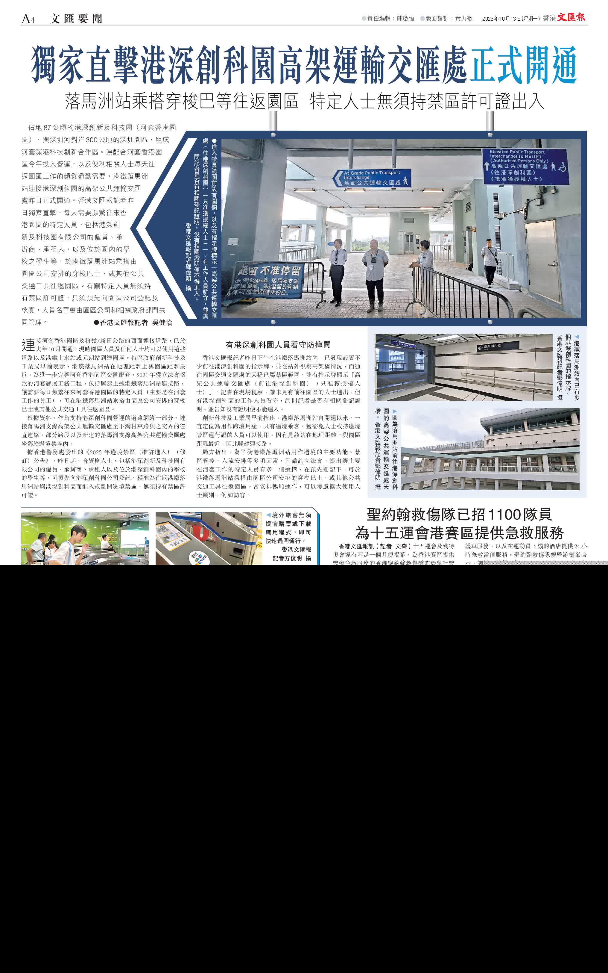 香港文匯報訊(記者 吳健怡)佔地87公頃的港深創新及科技園(河套香港園區),與深圳河對岸300公頃的深圳園區,組成河套深港科技創新合作區。為配合河套香港園區今年投入營運,以及便利相關人士每天往返園區工作的頻繁通勤需要,港鐵落馬洲站連接港深創科園的高架公共運輸交匯處昨日正式開通。香港文匯報記者昨日獨家直擊,每天需要頻繁往來香港園區的特定人員,包括港深創新及科技園有限公司的僱員、承辦商、承租人,以及位於園內的學校之學生等,於港鐵落馬洲站乘搭由園區公司安排的穿梭巴士,或其他公共交通工具往返園區。有關特定人員無須持有禁區許可證,只須預先向園區公司登記及核實,人員名單會由園區公司和相關政府部門共同管理。