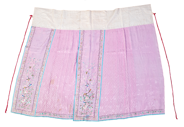 粉红暗花绸绣花鸟纹鱼鳞马面裙 二十世纪初 长104.5厘米 宽172厘米 广州博物馆藏