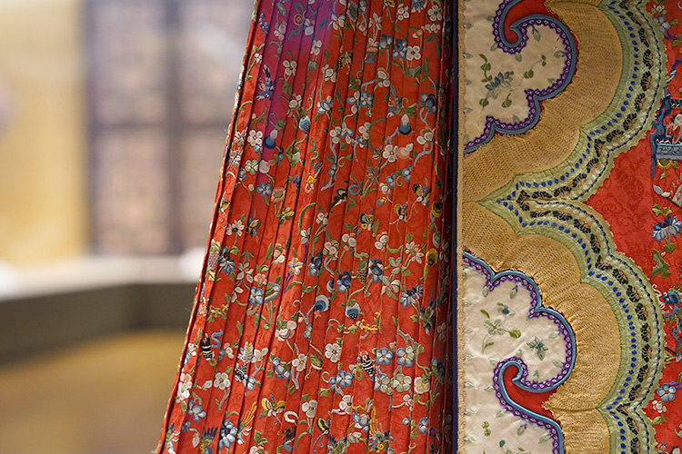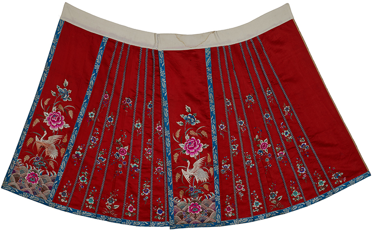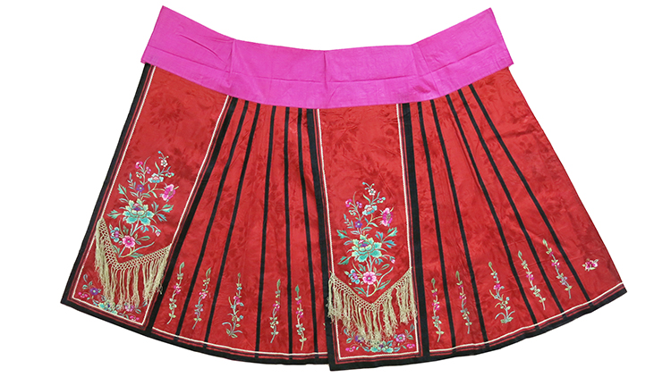 红色提花绸刺绣花卉纹阑干马面裙 二十世纪初长91厘米 宽177厘米 北京服装学院民族服饰博物馆藏