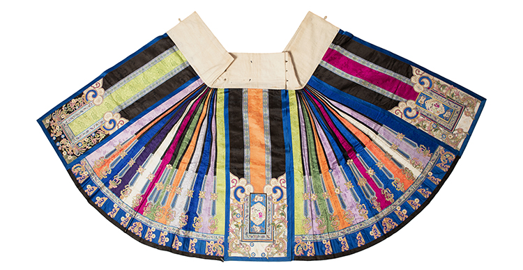 多色缎地绣庭院仕女缀花卉纹月华马面裙 清 长94.5厘米 宽121厘米 广州博物馆藏