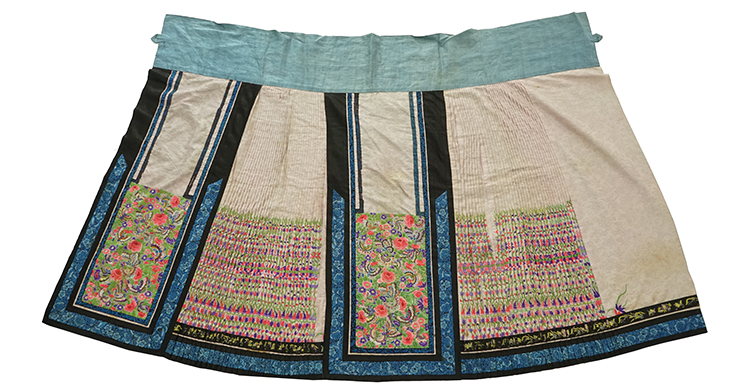 蓝色暗花缎地绣花鸟纹夹棉阑干马面裙 清 长118.2厘米 宽100.8厘米 北京服装学院民族服饰博物馆藏
