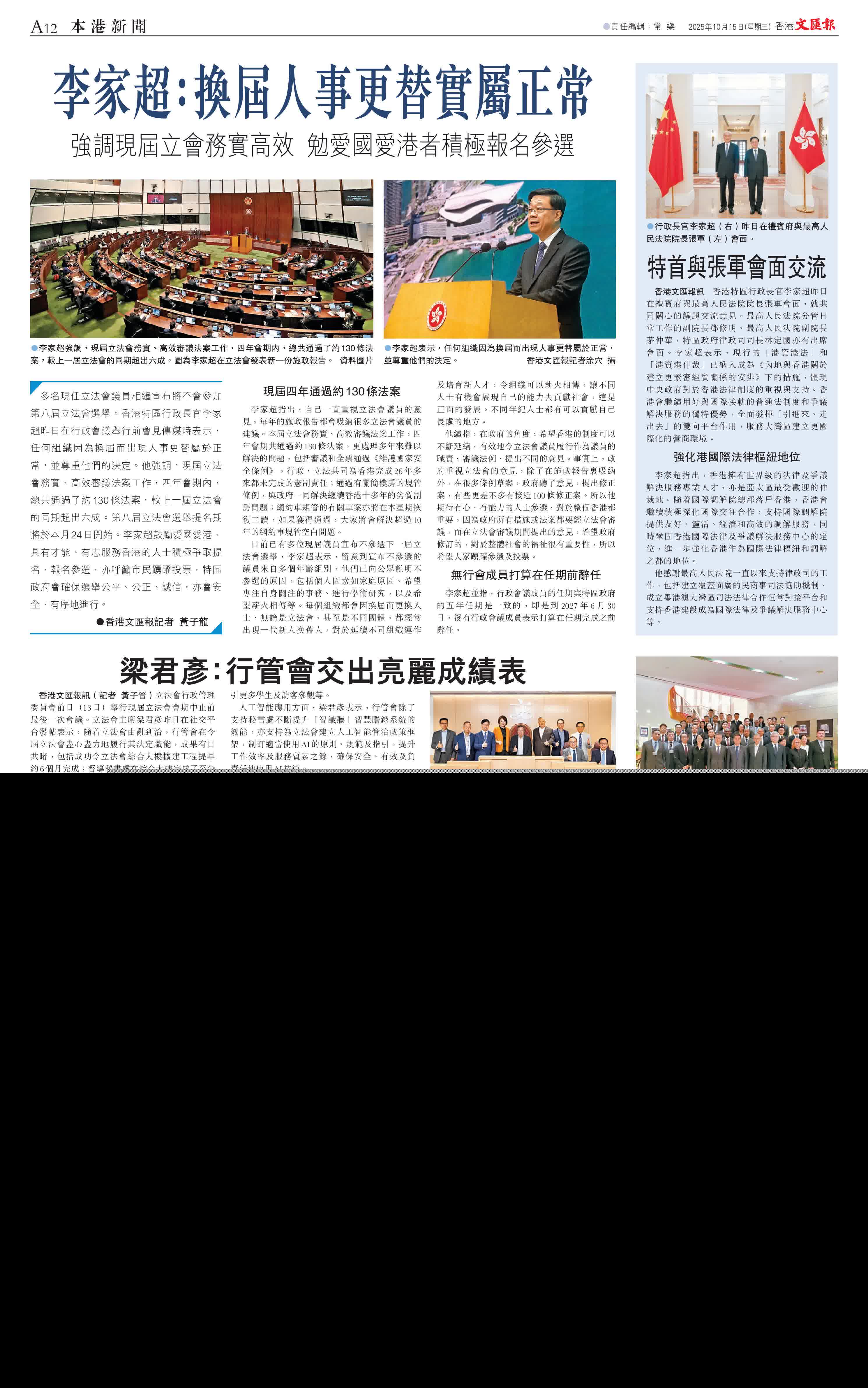 (香港文匯報記者 黃子龍)多名現任立法會議員相繼宣布將不會參加第八屆立法會選舉。香港特區行政長官李家超昨日在行政會議舉行前會見傳媒時表示,任何組織因為換屆而出現人事更替屬於正常,並尊重他們的決定。他強調,現屆立法會務實、高效審議法案工作,四年會期內,總共通過了約130條法案,較上一屆立法會的同期超出六成。第八屆立法會選舉提名期將於本月24日開始。李家超鼓勵愛國愛港、具有才能、有志服務香港的人士積極爭取提名、報名參選,亦呼籲市民踴躍投票,特區政府會確保選舉公平、公正、誠信,亦會安全、有序地進行。