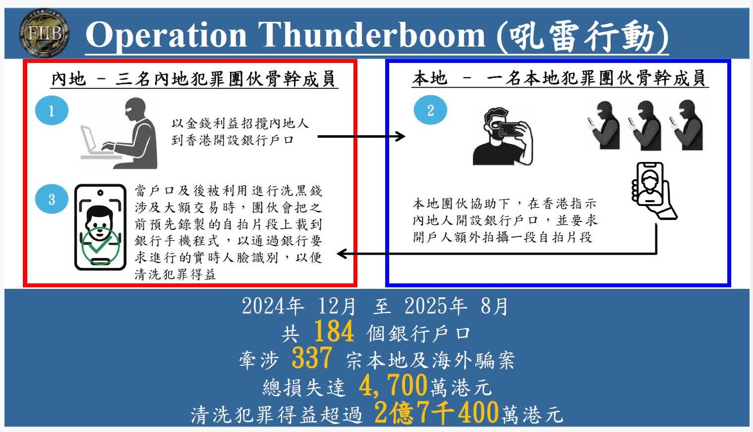 至前日(14日)及昨日(15日),香港警方聯同內地公安展開代號「吼雷」聯合執法行動,成功在中港兩地共拘捕3名集團骨幹成員。當中在香港,警方以涉嫌「串謀洗黑錢」罪拘捕一名姓盧(32歲)、報稱從事代購行業的本地男子,相信為集團骨幹成員,懷疑他與內地集團的成員招攬人士從內地到香港,再安排他們透過互聯網在數字銀行遙距開設銀行戶口從而獲取酬勞。警方其後搜查疑犯的酒店房間,共檢獲5部手機,並在手機內發現多段懷疑傀儡戶口持有人的自拍短片。該名被捕男子亦先後利用自己持有的16個銀行戶口,在去年1月至今年7月期間,共清洗5,400萬懷疑犯罪得益。該名被捕人已被警方暫控3項洗黑錢罪,將於今日稍後時間在東區裁判法院提堂。