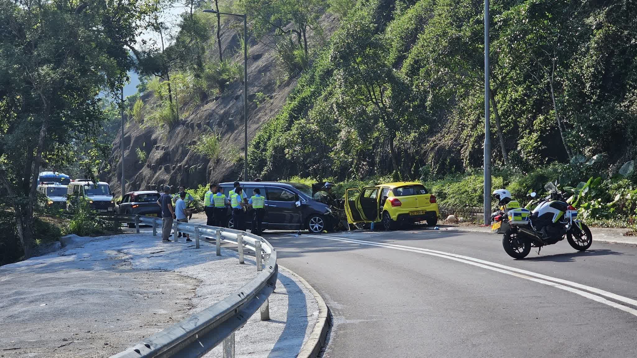 香港文匯報訊(記者 蕭景源)今早(19日)近8時,一輛掛有P牌的黃色私家車沿大埔新娘潭路往大埔方向行駛,當駛至涌尾一個彎位時,與一輛往鹿頸方向行駛的黑色七人車相撞,並波及另一輛灰色私家車。