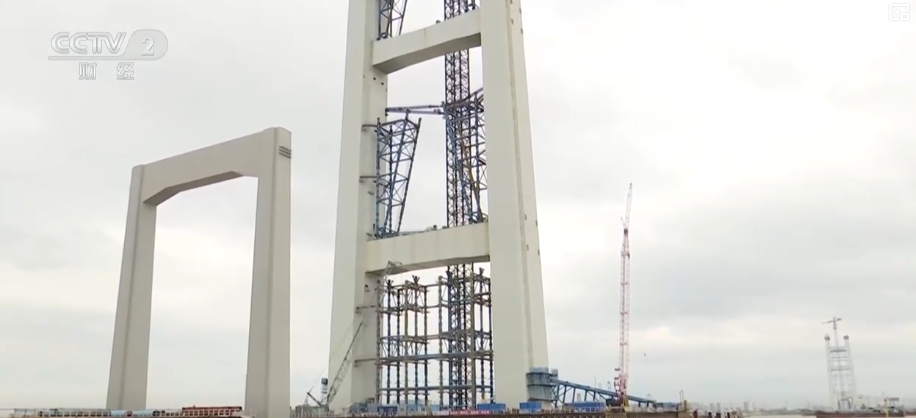 大湾区的交通网络让多个城市紧密相连。这里是正在建设中的狮子洋通道主桥索塔下,站在这仰头朝上看,非常努力才能勉强看到200多米高空上正在进行施工,而封顶后,它的主塔塔高将达到342米。