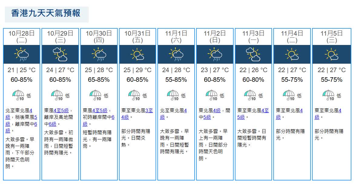 展望重陽節及星期四風勢頗大,短暫時間有陽光。星期五日間炎熱。周末期間氣溫稍為下降。29日(重陽節)大致多雲,初時有一兩陣微雨,日間短暫時間有陽光,氣溫介乎24至27度,顯著降雨概率預報低。30日(星期四)短暫時間有陽光,有一兩陣雨,氣溫介乎25至28度。31日(星期五)部分時間有陽光,日間炎熱,氣溫介乎25至29度。